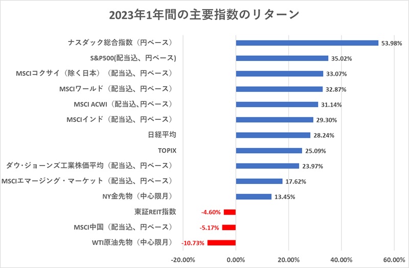 2023年を振り返ると、米国でハイテク企業の比率が高いNASDAQ市場の大勝利ということになった。ただ、米NASDAQは2022年は大幅なマイナスだった。ジェットコースターのように上下動が激しい市場といえ、投資するには値動きの大きさを覚悟して臨む必要がある。一方で、マイナスのパフォーマンスになった主要資産は少ない中で、「J−REIT(東証REIT指数)」や「中国」は2年連続のマイナスのパフォーマンスになった。今年から始まった「新NISA(少額投資非課税制度)」によって、新たに投資信託等の購入を考える人も少なくないと考えられるが、投資商品は選択した商品によって投資成果が大きく異なる。投資の開始にあたっては、投資する資産の過去の値動き等をしっかり確認した上で、投資対象商品を決定したい。 資産別の1年リターンを調べると、主要なインデックスで最も大きなプラスリターンを記録したのは「NASDAQ総合(円ベース)」の54%だった。「MSCIアルゼンチン(配当込み、円ベース)」の79%などもあるが、国内で取り扱いのある投資信託で比較的購入しやすいことを考えると「NASDAQに上場する銘柄への投資」が大きな投資成果をあげたということになる。実際には、NASDAQ市場に上場する全銘柄を対象にした「NASDAQ総合」より、NASDAQ上場企業の中から時価総額の大きな100銘柄でつくられた「NASDAQ100」に連動するインデックスファンドが一般的に利用されている。たとえば、「インデックスファンドNASDAQ100 (アメリカ株式)」は、昨年1年間のトータルリターンが65%だった。 次いで、米国株の中で主要な500銘柄を投資対象とした「S&P500(配当込み、円ベース)」が35%だった。「S&P500」に連動するインデックスファンドは、ここ数年間で人気を集めているが、その人気の背景は高い投資成果が期待できるというところにある。たとえば、「eMAXIS Slim米国株式(S&P500)」は純資産総額が3兆円を超え、個別の投資信託(ETF除く)としては最大規模の投資信託だ。この投資信託の昨年1年間のリターンは指数とほぼ同じ35%だった。 そして、日本を除く先進国株式を広くカバーする株価指数「MSCIコクサイ(除く日本)(配当込み、円ベース)」が33%、新興国を含む全世界の株式を対象とした株価指数「MSCI ACWI(オール・カントリー・ワールド・インデックス)(配当込み、円ベース)」が31%などとなっている。これら年間で30%以上の投資成果を実現した株価指数や、それに連動するインデックスファンドに投資していた人は、過去の平均と比べても、1年間の投資成果としては非常に高い運用成績をあげることができたといえる。 ただ、これらの株価指数は、2022年は軒並みマイナスのリターンになっていた。「NASDAQ総合(円ベース)」はマイナス23.4%、「NASDAQ100(円ベース)」はマイナス23.3%、「S&P500(配当込み、円ベース)はマイナス6.7%、「MSCIコクサイ(配当込み、円ベース)」はマイナス5.9%、「MSCI ACWI(配当込み、円ベース)」はマイナス6.1%などだ。NASDAQ指数は2022年のマイナス幅が大きかった分、2023年の上昇率も大きくなっているが、総じて、2022年の下落率よりも2023年の上昇率は大きかった。 一方、「東証REIT指数」は2022年がマイナス8.34%で、2023年もマイナス4.6%と2年連続のマイナス。「MSCI中国(配当込み、円ベース)」は2021年から3年連続マイナスという非常に厳しい運用成果になっている。ただ、「中国」は今でこそマイナス成果になっているが、2003年〜2007年は年間30%〜80%超というような非常に高いパフォーマンスを残していた期間もある。パフォーマンスの良し悪しは、その投資したタイミングの良し悪しによっても印象が大きく異なってくる。 このように、選んだ投資対象によって投資の収益が大きく異なるため、多くの人は「何を選べばよいのかよくわからない」ということになってしまい、結果的に投資に踏み切れないということになりがちだった。しかし、「新NISA」がスタートし、国策として「資産運用立国」ということもいわれている。「わからないから手を出さない」という姿勢を改めて、「わからないことについて理解することに努める」という姿勢も重要なのではないだろうか。その際には、米国株式単独(「NASDAQ100」や「S&P500」など)に投資するより、先進国株式に幅広く投資する「MSCIコクサイ(除く日本)」や「MSCIワールド」。さらには、新興国も含む全世界の株式を対象にした「MSCI ACWI」など、より広く分散された投資対象を選ぶことを考えたい。 加えて、数十万円や数百万円を一括で投資するのではなく、10万円の投資資金であれば毎月1万円、100万円の資金は毎月10万円など、小分けした資金で積立投資するというやり方もある。株式市場が上昇しても下落しても、毎月コツコツと購入を続けることで、購入金額を相対的に低く抑えられる(ドルコスト平均法)効果もある。タイミングを計っていると、いつまでも購入できずにいて、結果的に値上がりした投資信託を買いそびれるということもある。毎月定期的に購入すると考えれば、最初は目をつぶって飛び
