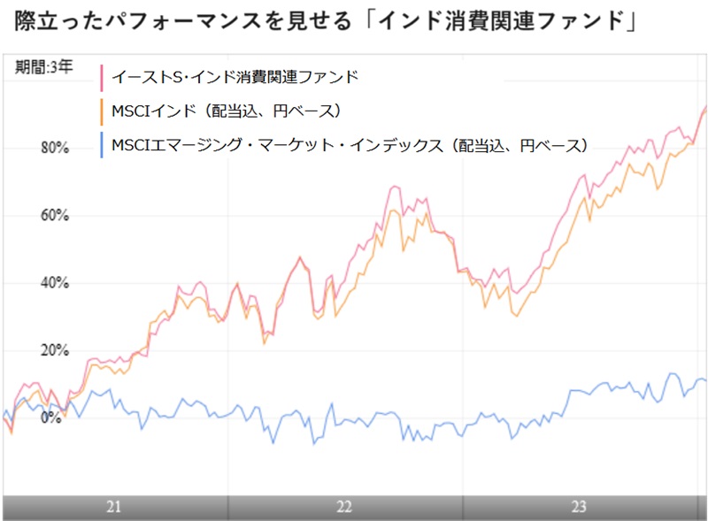 2024年の市場がスタートし、2023年を席巻した米国の「マグニフィセント・セブン」のような今年のリーダーがどこになるかが注目される。日本株が大きく値上がりしてスタートした一方、米国株は高値圏でのもみ合い。昨年に引き続き中国・香港株は弱く、欧州株も勢いがないようにみえる。その中で、インド株は堅調にスタートしている。昨年に人気を集めたインド株のインデックスファンド(SENSEXに連動めざす)「SBI・iシェアーズ・インド株式インデックス・ファンド『愛称:サクっとインド株式』」は、昨年末の基準価額1万277円が1月16日には1万655円に上昇。 また、もうひとつの代表的なインデックス「Nifty50」への連動をめざす「iFreeNEXT インド株インデックス」の基準価額も年末1万3092円から1万3677円に上昇している。今後の見通しについてアジアに充実した調査・運用拠点を置いているイーストスプリング・インベストメンツは、「インド消費市場の台頭がもたらす投資機会」と題したレポートを発表し、インドの個人消費の力強い成長についてレポートしている。 ここ数年の経済成長率の見通しでインドの成長期待は群を抜いている。世界銀行の2024年度のインド経済成長率の見通しは6.4%と、世界全体が2.4%成長を見通す中で、頭一つ抜け出した存在だ。2025年も6.5%成長とインドは堅調な経済成長が継続する見通した。そして、2006年から2023年までインドの経済成長率は年平均6.21%という世界最高水準の成長を実現し、イーストスプリングは「インドの力強い経済成長は家計支出を一変させている」と伝えている。2021年にインドの1人当たり家計支出は7.1%の伸びと、ASEANの5.2%増を大きく上回り、今後も年平均7.8%増での成長が期待され、2027年にはインドの世帯の約25.8%が年間可処分所得1万ドルを超えるとみられている。インドでは中間所得層(年間可処分所得が5000ドル以上3万5000ドル以下)の急拡大が注目され、現在、アメリカを抜いて世界最大の中間層市場を持つといわれている中国を今後10年の間で追い抜くとみられている。 そして、イーストスプリングはレポートで、「国が豊かになった結果、インドではこれまでの消費者とは異なる新たな消費者が台頭している。新たな消費者は購買に品質、多様性、利便性を求める傾向があり、体験型の商品への消費にも積極的。また、自分たちの価値観に沿った社会問題や環境問題への意識も高いという特徴がある」と指摘する。この消費行動の変化を「プレミアム化」と紹介しているが、「プレミアム化は、ファッション、自動車、食品・飲料など、複数のカテゴリーで見られる」と、インドの消費市場全体の変容があるとする。さらに、デリーやムンバイなど人口400万人以上を擁する大都市だけではなく、それよりも規模が小さいジャイプールなどのティア2(400万人未満)、さらに、100万人未満のティア3都市にまで「プレミアム化」の流れが波及しているという。 「プレミアム化」は、自動車販売の現場では「プレミアム車(70万ルピー以上)」の販売台数の伸びが「エコノミー車(70万ルピー未満)」を大きく上回るという顕著な変化となり、アパレルや酒類の販売もエコノミーよりもアッパーやラグジュアリーといわれるプレミアム商品の販売が好調になっている。このような個人消費の「プレミアム化」は、当然、そこに商品を提供する企業にとっては利益率の向上が期待され、インドの小売りや消費関連メーカーに大きな恩恵となると期待される。 さらに、イーストスプリングでは、インドの消費市場の進化として「デジタル化」と「都市化」をあげている。現在、インドの小売市場におけるオンライン販売のシェアは5%程度(2022年)に過ぎない。これは、インターネットユーザーが十分に定着していないこと、また、物流などのインフラが先進国や中国などに比べて遅れていることなどが背景になっているが、「インドにおけるオンライン小売の市場浸透率は今後5年間で9〜10%へと倍増すると予想されている」とネット販売の拡大を見通す。その根拠として「インドのオンライン購入の顧客は中高年、高所得層、ティア1都市の出身者が中心だった。しかし現在では、生まれたときからインターネットが普及している『Z世代』やティア2以下の都市の消費者にも広がるようになった」とネットユーザーの拡大をあげている。 また、「都市化」については、「インドの都市人口が総人口に占める割合は、2001年の28%から2020年には35%に増加し、2030年には40%に達する」という世界銀行の予測を引き合いに、農村部よりも賃金が高く、雇用機会も多く、教育や医療へのアクセスも良い都市部に生活することによって「都市部の消費者の所得水準と購買力が高まり、耐久消費財、娯楽、旅行、パーソナルケアなどの裁量的支出に費やす余裕が生じることになる」と消費の多様性と拡大を促すと見通している。そして、イーストスプリングのレポートは「インドの消費市場は2027年までに世界第3位の規模に成長