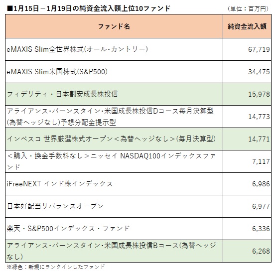 国内公募追加型株式投信(確定拠出年金専用、ファンドラップ専用、及びETF除く)を対象として、ウエルスアドバイザー推計値に基づいて先週(2024年1月15−19日)の純資金流入額上位10ファンドを確認したところ、フィデリティ投信が19日に設定した「フィデリティ・日本割安成長株投信」(愛称:テンバガー・ハンター・ジャパン)が約160億円の純資金流入となり、第3位となった。 「フィデリティ・日本割安成長株投信」は実質的に国内上場企業の株式に投資する。銘柄選定に際しては、企業の長期的な成長力と株価の割安度に着目する。同社の旗艦ファンドシリーズである「フィデリティ・世界割安成長株投信」(愛称:テンバガー・ハンター)と同じ運用チームが同じ戦略で運用を行う日本株ファンドである。 同ファンドのほかには、「インベスコ 世界厳選株式オープン<為替ヘッジなし>(毎月決算型)」(愛称:世界のベスト)と「アライアンス・バーンスタイン・米国成長株投信Bコース(為替ヘッジなし)」が新規にトップ10入りした。両ファンドとも1月4−5日以来2週ぶりのランクインとなる。 先週の純資金流入額トップは「eMAXIS Slim全世界株式(オール・カントリー)」。約677億円の純資金流入となり、4週連続のトップとなった。同ファンドのほかには、「eMAXIS Slim米国株式(S&P500)」、「アライアンス・バーンスタイン・米国成長株投信Dコース毎月決算型(為替ヘッジなし)予想分配金提示型」、「<購入・換金手数料なし>ニッセイ NASDAQ100インデックスファンド」、「iFreeNEXT インド株インデックス」、「日本好配当リバランスオープン」、「楽天・S&P500インデックス・ファンド」(愛称:楽天・S&P500)が先々週(1月9−12日)に続いてトップ10内となった。 一方、先々週トップ10入りしていたファンドのうち、「楽天・オールカントリー株式インデックス・ファンド」(愛称:楽天・オールカントリー)、「SBI・V・S&P500インデックス・ファンド」(愛称:SBI・V・S&P500)、「iFreeNEXT FANG+インデックス」がトップ10圏外となった。