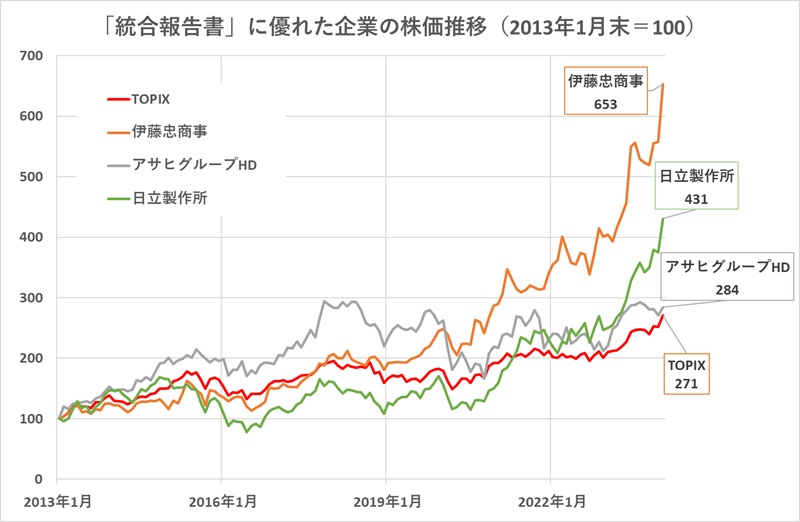 年金積立金管理運用独立行政法人(GPIF)は2月21日、「GPIFの国内株式運用機関が選ぶ『優れた統合報告書』と『改善度の高い統合報告書』」を発表した。2018年1月に最初のレポートを発表して以来、毎年、運用機関の評価を集約し、その結果を公表している。「優れた統合報告書」と評価された企業は、ニュースリリース等を通じて「GPIFの国内株式運用機関が選ぶ優れた統合報告書に選出された」と発表するようになり、企業の間に統合報告書の作成を促す効果も出ていると考えられる。国家戦略としてインベストメント・チェーン全体の質的向上を目指すことをめざす日本で、アセットオーナーの頂点に立つGPIFが率先して統合報告書の重要性をアピールしている。新NISAでは、投資信託とともに上場株式への投資も可能だ。長期に投資できる投資先企業を選定する際に、GPIFの国内株式運用機関の評価は参考になるだろう。 「統合報告書」は、「有価証券報告書」や「アニュアルレポート(年次報告書)」において公表される定量的な財務情報に加えて、企業理念や社長メッセージなど数値だけではわからない非財務情報をまとめた資料のこと。「財務情報」と「非財務情報」を統合して発表することから「統合報告書」といわれている。「有価証券報告書」などが主に株主や投資家などステークホルダー向けのIR(投資家向け情報)資料と位置付けられることに対し、「統合報告書」は株主、投資家、取引先や金融機関以外にも地域社会や従業員など、より幅広い関係先に向けた情報発信という側面がある。特に、近年では「サステナビリティ(事業の持続可能性)」や「ESG(環境・社会・ガバナンス)」などの非財務情報が重要視されるようになっていることから、「有価証券報告書」のように発行が義務付けられているわけではない「統合報告書」の重要性が増している。 今回のレポートは、GPIFが国内株式の運用を委託している13運用機関に対し、「優れた統合報告書」と「改善度の高い統合報告書」について、それぞれ最大10社の選定を依頼した。「優れた統合報告書」については延べ70社(前回は67社)、「改善度の高い統合報告書」は延べ100社(前回95社)が選ばれた。この結果についてGPIFでは、「企業規模別で見ると、優れた統合報告書では、相対的に経営リソースが豊富な大型企業が選定の約半数を占めていますが、改善度の高い統合報告書では中小型企業が大半となるなど、統合報告書の作成の広がりと質の向上が伺えます」としている。 「優れた統合報告書」として最多の6機関から評価を得たのは「伊藤忠商事」だった。伊藤忠商事は、GPIFが発表を開始した2018年から毎年「優れた統合報告書」として評価され、7年連続で選定された。運用機関が評価するポイントは、「企業価値向上に向けたスターリーがわかりやすい」「CEOメッセージも相変わらず迫力ある」「持続可能な価値創造のためのモデルが明確に定義されている」など。 次に、「日立製作所」が5機関から評価された。日立製作所も7年連続で「優れた統合報告書」に選ばれている。評価のポイントは、「CFOが情報開示WGを統括し企画・制作に全社がコミットしている体制がよく表れている」「事業の成長をもたらす仕組みについての説明が充実」など。そして、同じく5機関から評価されたのが「アサヒグループホールディングス」。6年連続での「優れた統合報告書」に選定された。「インパクトの可視化、人的資本の高度化、TCFDとTNFDの統合的対応など、先進的な取組みがなされている」などと評価された。 「改善度の高い統合報告書」は、複数機関から選定されたのは2機関からに止まり、評価がばらけている。その理由は、選定企業の規模は、大型企業が24社、中型企業が60社、小型企業が16社と、中小型企業が全体の76%を占めており、複数の運用会社がカバーしきれていないということも要因だろう。逆に、それほど小型企業も含む多様な企業が統合報告書の作成に力を入れるようになっているということもできる。 統合報告書の作成は上場企業の間に根付いてきているが、その報告書の内容が、株価にどのような評価として現れるだろうか。今回、5機関以上から「優れた統合報告書」を作っていると高く評価された3社の株価推移をTOPIX(東証株価指数)と比較した。比較期間は、政府から「コーポレートガバナンス」の強化が言われ始めた2013年を起点とし、「コーポレート・ガバナンスコード」が導入された2015年、そして、2017年7月にGPIFが、3つのESG指数を採用してパッシブ運用を開始した「ESG投資元年」を経て、2024年1月末までを振り返った。 2018年1月にGPIFの運用委託機関から「優れた統合報告書」の評価を多くの機関から受けている伊藤忠商事は、その評価が公表開始された2018年頃から、TOPIXに対して明らかなアウトパフォームが観測される。そして、ESG投資が機関投資家の間で一つの潮流となった2020年以降に伊藤忠商事の株価は大きく上昇する。2020年8月には米国で「投