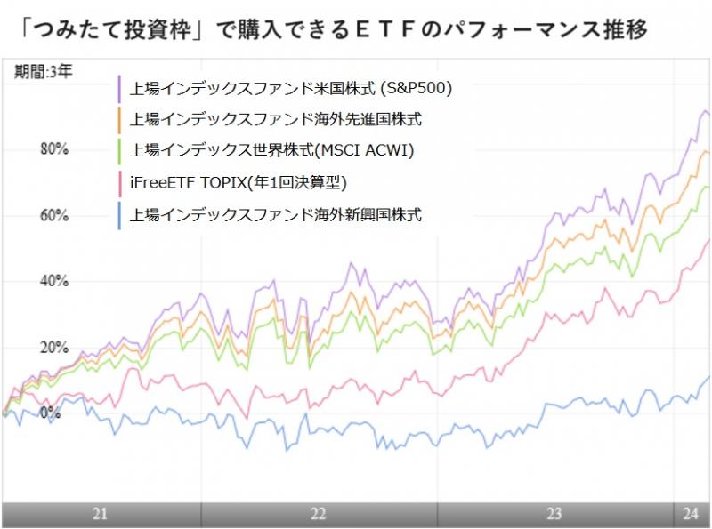 今年1月にスタートした新NISAは、1人当たりの投資収益非課税枠が1800万円、非課税対象期間も無期限ということもあり、これを機に投資をスタートする人も少なくないと考えられる。折しも、日経平均株価が1989年の史上最高値を34年ぶりに更新した。「新NISAを使って何に投資すれば、最も効果的に運用ができるだろうか」と考え中の方も少なくないと考える。そこで、新NISAで購入できる主な投資信託の種類やその特徴について概観してみたい。ここでは投資信託協会や金融庁が発表している商品リストに基づいて紹介する。実際には、個々の金融機関によって取り扱いの有無が生じることにご留意いただきたい。「つみたて投資枠」で買えるETF(上場投資信託)もチェックしておきたい。 ETFとは、証券取引所に上場し、時価で売買できる投資信託だ。一般の公募投資信託が1日あたり値段が1つしかなく、しかも、平日の夜間に価格が更新されるため、投資信託の購入時には価格が決まっていないことに対し、上場しているETFは同じように分散投資が効いた投資信託であるにもかかわらず、時価があり、その価格は刻一刻と変化している。このため、値段を指定して購入することもできる。しかも、運用コストは一般の投資信託よりも低く抑えられる傾向があるため、投資商品としての需要は低くない。ただ、「つみたて投資枠」で購入可能なETFは、わずか8本(2024年1月30日現在)と限定的だ。「つみたて投資枠」に採用される条件が厳しい他、新NISAの投資対象として「つみたて投資枠」のETFを取り扱っている販売会社が非常に少ないため、新規の追加ニーズも高まっていない。そもそも「つみたて投資枠」は、つみたて投資による購入を前提とした口座であるため、購入時にはETFの大きな特徴である時価で買えるというメリットが小さいことも取り扱い販社が増えない理由になっていると考えられる。 「つみたて投資枠」の対象ETFに採用される条件は、(1)信託期間が無期限、または、20年以上、(2)ヘッジ目的等を除きデリバティブ運用を行っていない、(3)投資対象資産が株式であること、(4)分配頻度が毎月でない――という一般の投資信託が「つみたて投資枠」の対象となるために設けられている条件と同じ項目に加え、つみたて投資枠のETFならではの条件として、(5)指定したインデックスに連動していること、(6)最低取引単位が1000円以下、(7)円滑な流動のための措置が取られていると国内取引所が指定するもの、(8)外国取引所に上場されている場合、資産残高が1兆円以上、(9)販売手数料1.25%(税抜き)以下、(10)口座管理手数料ゼロ、(11)信託報酬0.25%(税抜き)以下――という条件がある。 現在の8本のラインナップは、オーソドックスで代表的な指定インデックスに連動するETFばかりになっている。国内株インデックスでは「TOPIX(東証株価指数)」、「日経225」、「JPX日経400」に連動するETFが各1本。そして、国外では米「S&P500」に連動するETFが2本、そして、全世界株式「MSCI ACWI」、先進国株式(除く日本)「MSCIーKOKUSAI」、新興国株式「MSCIエマージング」に連動するETFが各1本だ。そのパフォーマンスは、過去3年で最も優れた「S&P500」(トータルリターン3年・年率23.84%)から、「MSCI−KOKUSAI」(同21.51%)、「MSCI ACWI」(同19.00%)、「TOPIX」(同14.80%)となり、「MSCIエマージング」(同」2.82%)が劣っているという成績だ。 もちろん、これら代表的な株価指数に連動する一般の公募投資信託は複数存在し、しかも、「つみたて投資枠」で購入できる商品も多い。さらに、一般の投資信託であれば、取り扱い販売会社も多い。また、運用コストについても、一般の公募投資信託は十分に低くなっていて、むしろ、ETFの信託報酬等の水準の方が高いくらいだ。その点では、新NISAの「つみたて投資枠」であえてETFを購入するメリットは大きくはない。むしろ、ETFの時価が見える特性を活かすのであれば、「成長投資枠」で一括して投資するニーズにあるようにもみえる。「成長投資枠」の投資対象になっているETFについては、現在238本あり、多様な商品があるため、項目を改めて紹介したい。(グラフは、「つみたて投資枠」の投資対象ETFのパフォーマンス推移)