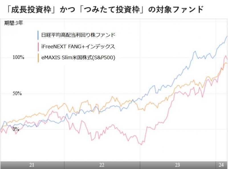 反対に米国は、年5%以上の水準まで急速に引き上げた政策金利を「引き下げ」のタイミングを迎えている。金利を引き下げるのは、景気が減速したことを受けた措置だ。好景気で企業業績の成長が株高を支えてきた米国で、景気が鈍化していることは警戒が必要な事態だ。このように、日米ともに上昇を続けてきた株価に変調の兆しがあるところなので、単純な積立投資を継続するだけでなく、大きく市場が崩れた場合などは、株価が下落したところでまとまった追加投資を実施する(ナンピン買い)など、きめ細かな対応が必要なところといえる。NISAの枠を使いながらも、「つみたて投資枠」、かつ、「成長投資枠」の対象ファンドであれば、それぞれの枠にある非課税限度額を上手に活かした柔軟な投資が可能だ。特に、過去3年程度のパフォーマンスに優れたファンドは、これからの日米株価の動向に大きな影響を受ける可能性も強いため、できるだけ柔軟な対応ができた方が良いだろう。新NISAの2つの投資枠を使って投資ができる投資信託を上手に活用することを考えたい。(グラフは、「つみたて投資枠」と「成長投資枠」の両方で投資できるファンドのパフォーマンス)