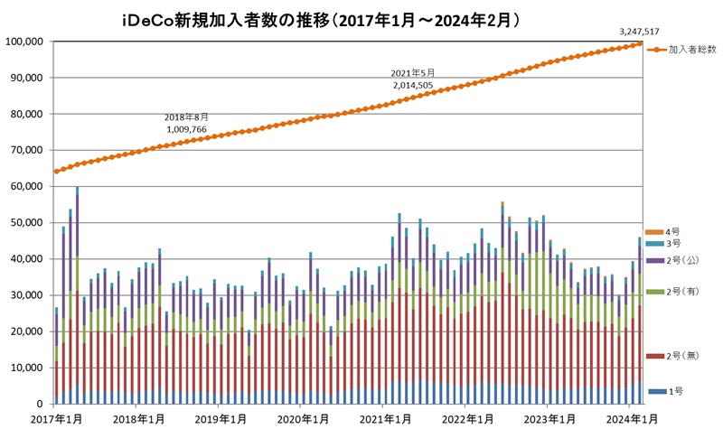 国民年金基金連合会が4月1日に発表したiDeCo(イデコ、個人型確定拠出年金)の業務状況によると2024年2月の新規加入者数は4万6119人で加入者総数は324万7517人になった。2月の新規加入者数は前年同月比で11.7%増となった。新規加入者数は、2023年2月から12カ月連続で前年同月比割れになり、13カ月ぶりに前年同月比を上回った。第2号加入者の新規加入者数は3万7365人となり、2月の加入者数としては2017年2月の4万3694人以来、7年ぶりの3万7000人超えになった。なお、従業員のiDeCoに企業が上乗せ拠出をするiDeCo+(イデコプラス:中小事業主掛金納付制度)は、実施事業所数は7284事業所、対象従業員数は4万6269人になった。 1月の新規加入者の内訳は、第1号加入者は6218人(前月5600人)、第2号加入者は3万7365人(前月3万1627人)、第3号加入者は2224人(前月1972人)となった。第2号加入者の中で、企業年金なしの新規加入者が2万1052人(前月1万8121人)。「企業年金あり」が8723人(前月7177人)。共済組合員(公務員)の新規加入者は6329人(前月5686人)となった。 12カ月連続で前年同月比割れだったiDeCoの新規加入者数が、13カ月ぶりに前年同月比プラスに転じた。2024年1月から新NISAが始まり、国を挙げて「資産運用立国」に向けた取り組みが強化されている。4月には、国民の金融リテラシーを高めるための司令塔として期待される「金融経済教育推進機構」が設立され、今夏からの本格稼働が予定されている。国民の共通認識としての資産運用の必要性への理解を深め、新NISAやiDeCoなどの税制優遇口座を、それぞれの制度特性を活かして日々の生活に取り込んでいけるかどうかが、これからの課題になる。 先日、厚生労働省が実施した私的年金についての世論調査において、「老後に向け準備したい、または、準備した公的年金以外の資産」について聞いた問いに対する答えは、「預貯金」が7割程度、次いで、「退職金や企業年金」が3割程度だった。そして、「NISA」は2割程度、「iDeCo」は8.9%という回答率になっていた。老後の資金を用意する手段として「NISA」を活用することも1つの方法であるが、「NISA」はいつでも解約ができる制度であり、「住宅購入の頭金」、「子どもの大学進学費用」など比較的まとまった資金が必要な人生のイベントで使う資金を増やすための口座としての性格も併せ持っている。この点、「iDeCo」は老後のための資金づくりだけのために用意された制度であり、60歳になるまで資金が引き出せなくなっている。「老後のために準備したい資産」をつくる手段としては、「NISA」よりも先に「iDeCo」がイメージされるようなくらいには、「iDeCo」の認知度が高まることが望ましい。 実際問題として、「子育て支援策」については、こども家庭庁が2023年4月に発足するなど、少子化対策として様々な角度から対応策が充実してきているが、老後を支える「年金」については、2024年度の支給額は2.7%引き上げられるものの、過去3年間の名目賃金上昇率3.1%に対して「マクロスライド調整率」がマイナス0.4%適用され、実質的には目減りする減額修正になっている。高齢社会で、年金受給者が増え続ける中で、現役世代の負担をこれ以上増やさないための工夫や改定に主眼が置かれているようだ。制度を維持・存続させることが大前提となれば、制度の支え手である現役世代の理解を優先することはもっともといえるが、年金を受け取る側に回ると、「生活の糧」と頼みにしている年金の支給額が減るのは心細い限りだろう。仕事を引退して後に老後資金の心配をしなくて済むように、現役世代の間に、iDeCoやNISAといった制度を活用して十分な備えを行う必要がある。復調し始めたiDecoの新規加入が、一段と拡大していくかどうか、注目していきたい。