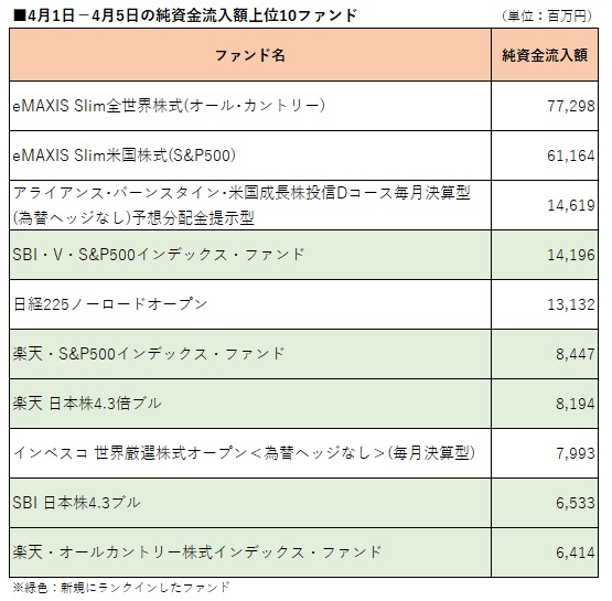 国内公募追加型株式投信(確定拠出年金専用、ファンドラップ専用、及びETF除く)を対象として、ウエルスアドバイザー推計値に基づいて先週(2024年4月1日−5日)の純資金流入額上位10ファンドを確認したところ、「eMAXIS Slim全世界株式(オール・カントリー)」が2週連続のトップとなったほか、5ファンドがトップ10内に返り咲いた。 「eMAXIS Slim全世界株式(オール・カントリー)」は約773億円の純資金流入となった。同ファンドのほかには、「eMAXIS Slim米国株式(S&P500)」、「アライアンス・バーンスタイン・米国成長株投信Dコース毎月決算型(為替ヘッジなし)予想分配金提示型」、「日経225ノーロードオープン」、「インベスコ 世界厳選株式オープン<為替ヘッジなし>(毎月決算型)」(愛称:世界のベスト)が先々週(3月25日−29日)に続いてトップ10入りした。 先週新たにランクインしたのは、「SBI・V・S&P500インデックス・ファンド」(愛称:SBI・V・S&P500)、「楽天・S&P500インデックス・ファンド」(愛称:楽天・S&P500)、「楽天 日本株4.3倍ブル」、「SBI 日本株4.3ブル」、「楽天・オールカントリー株式インデックス・ファンド」(愛称:楽天・オールカントリー)の5ファンド。順に、3月4日−8日以来、3月11日−15日以来、2月19日−22日以来、1月4日−5日以来、2月13日−16日以来のランクインとなった。 一方、先々週トップ10入りしていたファンドのうち、「野村 世界業種別投資シリーズ(世界半導体株投資)」、「アライアンス・バーンスタイン・米国成長株投信Bコース(為替ヘッジなし)」、「インド小型厳選株式ファンド」、「半導体関連 世界株式戦略ファンド」(愛称:半導体革命)、「YMアセット・バランスファンド(成長タイプ)」(愛称:トリプル維新ファンド(成長タイプ))がトップ10圏外となった。