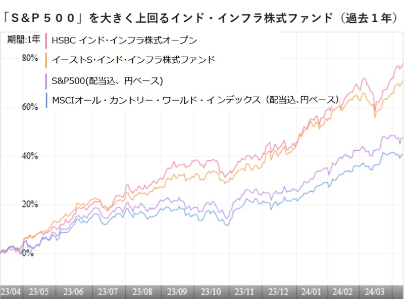 投資信託のパフォーマンス(運用成果)を評価する代表的な指標としてリスク(標準偏差)あたりのリターンを示す「シャープ・レシオ」がある。同じリターンをあげている商品を比較して、より小さなリスクの方を高く評価するのだが、一般的に、シャープレシオは「1」を超えていれば優秀とみなされ、「2」以上になると非常に優秀なファンドという評価をされる。しかし、今現在の投信市場には、シャープレシオが「6」を超えるファンドが存在する。3月末時点で期間1年のシャープレシオが6.69を記録しているのが「HSBCインド・インフラ株式オープン」、そして、「イーストスプリング・インド・インフラ株式ファンド」は6.34だ。その他、インド関連の株式ファンドが軒並みシャープレシオで5以上をたたき出している。 シャープレシオの計算式は、特定期間のトータルリターンを分子にして、分母にはその期間のリスク(標準偏差)からリスクフリーレート(預貯金等の金利)を差し引いた値を置く。今の日本ではリスクフリーレートはゼロであるため、単純にトールリターンをリスクで割った指標と考えればよい。そこで、シャープレシオがトップになっている「HSBCインド・インフラ株式オープン」の過去1年間のトータルリターンは3月末時点で75.97%で、この期間のリスク(標準偏差)は11.35%になっている。2ケタに足がかかるほどの価格のブレがあったものの、リターンが非常に大きかったために、シャープレシオが非常に大きな値になっている。 このシャープレシオの水準だが、このところ資金流入額でトップになっている「eMAXIS Slim 全世界株式(オール・カントリー)」では3.47、それに次ぐ人気銘柄の「eMAXIS Slim 米国株式(S&P500)」は3.76だ。この2つのファンドのシャープレシオも非常に高い数値なのだが、それにもまして優れているのがインド・インフラ株ファンドということになる。「オルカン」や「S&P500」との差になっているのは、トータルリターンの水準だ。インド・インフラ株ファンドが75%に対し、「S&P500」は49%、「オルカン」は41.10%と一段階低い水準になっている。 相対的にインド株ファンドのシャープレシオを引き上げているのは、トータルリターンの高さだ。インド・インフラ株ファンドに次ぐ高いシャープレシオになっている「イーストスプリング・インド・コア株式」(シャープレシオは5.85)の過去1年間のトータルリターンは62.73%、「ノムラ・印度・フォーカス」(同5.67)は65.90%だった。 過去1年間のリスクは、新興国に分類されるインド株で、しかも、インフラ関連にフォーカスしたファンドであっても11%程度、インド株全般を対象としたファンドでは10%程度と一段と低くなっている。価格のブレが株式ファンドとしては小さく、ファンドの基準価額(分配金再投資ベース)の動きは、直線に近い形で右肩上がりになっている。投資対象としては理想的な軌跡といえる推移だ。このようなリスク水準が年15%以下の比較的低い水準にあるのは、米国の「S&P500」なども同じようなことが言え、これらリスク水準が低い株式ファンドの価格推移などを背景に、現在の相場付きを「ゴルディロックス相場(適温相場)」とみる向きもある。 いずれにしても、投資信託を使った資産形成において、シャープレシオの高いファンドに着目することはひとつの目安になる。現在のように株式ファンドのトータルリターンが高く出ている時期には、より高いトータルリターンのファンドを探すということに加えて、シャープレシオの高いファンドを選ぶと比較的リスクを抑えて高いリターンを得ることができる。そのシャープレシオランキングでインド株式に投資するファンドが軒並み好成績をたたき出していることに注目したい。(グラフは、「S&P500」を大きく上回るインド・インフラ株式ファンド)