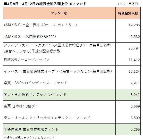 国内公募追加型株式投信(確定拠出年金専用、ファンドラップ専用、及びETF除く)を対象として、ウエルスア ドバイザー推計値に基づいて先週(2024年4月8日−12日)の純資金流入額上位10ファンドを確認したところ、「eMAXIS Slim全世界株式(オール・カントリー)」が3週連続のトップとなったほか、2ファンドがトップ10内に返り咲いた。 「eMAXIS Slim全世界株式(オール・カントリー)」は約493億円の純資金流入となった。同ファンドのほかには、「eMAXIS Slim米国株式(S&P500)」、「アライアンス・バーンスタイン・米国成長株投信Dコース毎月決算型(為替ヘッジなし)予想分配金提示型」、「日経225ノーロードオープン」、「インベスコ 世界厳選株式オープン<為替ヘッジなし>(毎月決算型)」(愛称:世界のベスト)、「楽天・S&P500インデックス・ファンド」(愛称:楽天・S&P500)、「楽天 日本株4.3倍ブル」、「楽天・オールカントリー株式インデックス・ファンド」(愛称:楽天・オールカントリー)が先々週(4月1日−5日)に続いてトップ10入りした。 先週新たにランクインしたのは、「楽天・全米株式インデックス・ファンド」(愛称:楽天・VTI)と「半導体関連 世界株式戦略ファンド」(愛称:半導体革命)。順に、23年12月11日−15日以来約4カ月ぶり、今年3月25日−29日以来2週ぶりのランクインとなった。 一方、先々週トップ10入りしていたファンドのうち、「SBI・V・S&P500インデックス・ファンド」(愛称:SBI・V・S&P500)、「SBI 日本株4.3ブル」がトップ10圏外となった。