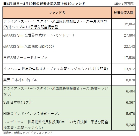 国内公募追加型株式投信(確定拠出年金専用、ファンドラップ専用、及びETF除く)を対象として、ウエルスアドバイザー推計値に基づいて先週(2024年4月15日−19日)の純資金流入額上位10ファンドを確認したところ、「アライアンス・バーンスタイン・米国成長株投信Dコース毎月決算型(為替ヘッジなし)予想分配金提示型」(=AB・米国成長株投信Dコース(H無) 予想分配金)が約321億円の純資金流入となり、2022年8月15日−19日以来、1年8カ月ぶりのトップとなった。 「アライアンス・バーンスタイン・米国成長株投信Dコース毎月決算型(為替ヘッジなし)予想分配金提示型」は先々週(4月8日−12日)の3位から浮上した。15日に決算を行い、分配金(1万口当たり、税引前)を400円とした。 同ファンドのほかには、「eMAXIS Slim全世界株式(オール・カントリー)」、「eMAXIS Slim米国株式(S&P500)」、「日経225ノーロードオープン」、「インベスコ 世界厳選株式オープン<為替ヘッジなし>(毎月決算型)」(愛称:世界のベスト)、「楽天 日本株4.3倍ブル」が先々週に続いてトップ10入りした。 先週新たにランクインしたのは4ファンド。「アライアンス・バーンスタイン・米国成長株投信」の「Bコース(為替ヘッジなし)」は今年の3月25日−29日以来、「SBI 日本株4.3ブル」は同4月1日−5日以来、「HSBC インド・インフラ株式オープン」は同2月26日−3月1日以来、「フィデリティ・世界割安成長株投信Dコース(毎月決算・予想分配金提示型・為替ヘッジなし)」(愛称:テンバガー・ハンター)は23年以降で初めてのランクインとなった。 一方、先々週トップ10入りしていたファンドのうち、「楽天・S&P500インデックス・ファンド」(愛称:楽天・S&P500)、「楽天・全米株式インデックス・ファンド」(愛称:楽天・VTI)「楽天・オールカントリー株式インデックス・ファンド」(愛称:楽天・オールカントリー)、「半導体関連 世界株式戦略ファンド」(愛称:半導体革命)がトップ10圏外となった。