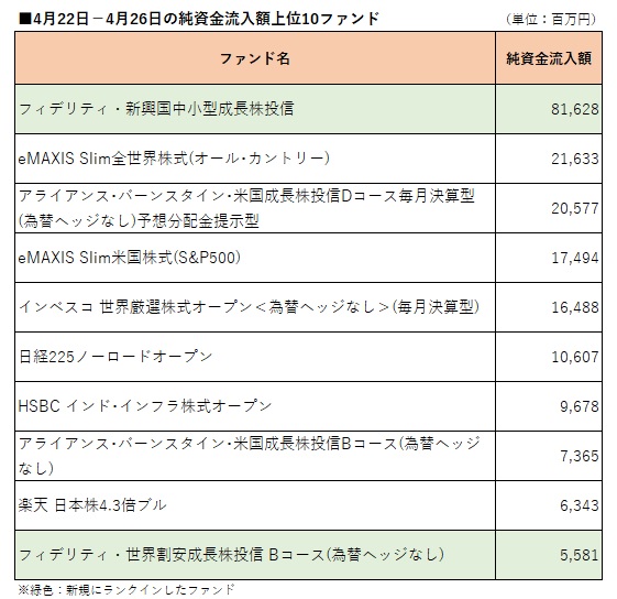 国内公募追加型株式投信(確定拠出年金専用、ファンドラップ専用、及びETF除く)を対象として、ウエルスアドバイザー推計値に基づいて先週(2024年4月22日−26日)の純資金流入額上位10ファンドを確認したところ、フィデリティ投信が24日に新規設定した「フィデリティ・新興国中小型成長株投信」(愛称:エマージング・ハンター)が816億円の純資金流入でトップとなった。 「フィデリティ・新興国中小型成長株投信」は、新興国の株式市場に上場している中小型企業、及びその他の株式市場に上場する新興国と緊密な経済関係のある中小型企業の株式に投資する。ビジネスモデル、業界構造、参入障壁の高さ、経営陣の質などを分析し、長期にわたって利益成長が見込まれる株価に割安感のある企業に投資する。 同ファンドのほかには、「フィデリティ・世界割安成長株投信 Bコース(為替ヘッジなし)」(愛称:テンバガー・ハンター)が新規にランクインした。3月18日−22日以来の返り咲きとなった。 先々週(4月15日−19日)に続いてランクインしたのは、「eMAXIS Slim全世界株式(オール・カントリー)」、「アライアンス・バーンスタイン・米国成長株投信Dコース毎月決算型(為替ヘッジなし)予想分配金提示型」、「eMAXIS Slim米国株式(S&P500)」、「インベスコ 世界厳選株式オープン<為替ヘッジなし>(毎月決算型)」(愛称:世界のベスト)、「日経225ノーロードオープン」、「HSBC インド・インフラ株式オープン」、「アライアンス・バーンスタイン・米国成長株投信Bコース(為替ヘッジなし)」、「楽天 日本株4.3倍ブル」の8ファンド。 一方、先々週トップ10入りしていたファンドのうち、「SBI 日本株4.3ブル」、「フィデリティ・世界割安成長株投信Dコース(毎月決算・予想分配金提示型・為替ヘッジなし)」(愛称:テンバガー・ハンター)がトップ10圏外となった。