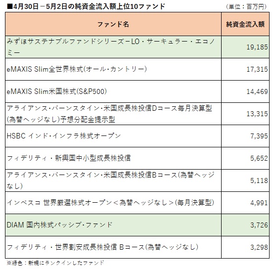 国内公募追加型株式投信(確定拠出年金専用、ファンドラップ専用、及びETF除く)を対象として、ウエルスアドバイザー推計値に基づいて先週(2024年4月30日−5月2日)の純資金流入額上位10ファンドを確認したところ、アセットマネジメントOneが4月30日に新規設定した「みずほサステナブルファンドシリーズ−LO・サーキュラー・エコノミー」(=LO・サーキュラー・エコノミー)が約192億円の純資金流入でトップとなった。 「みずほサステナブルファンドシリーズ−LO・サーキュラー・エコノミー」は実質的に、世界の企業(日本、新興国含む)の中から、サーキュラーエコノミー(循環経済)の実現に寄与する事業に取り組み、成長が期待される企業の株式に投資する。販売会社はみずほ証券とみずほ銀行。同ファンドのほかには、「DIAM 国内株式パッシブ・ファンド」が新規にランクインした。2023年以降で初めてのランクインとなる。 先々週(4月22日−26日)に続いてランクインしたのは、「eMAXIS Slim全世界株式(オール・カントリー)」、「eMAXIS Slim米国株式(S&P500)」、「アライアンス・バーンスタイン・米国成長株投信Dコース毎月決算型(為替ヘッジなし)予想分配金提示型」、「HSBC インド・インフラ株式オープン」、「フィデリティ・新興国中小型成長株投信」(愛称:エマージング・ハンター)、「アライアンス・バーンスタイン・米国成長株投信Bコース(為替ヘッジなし)」、「インベスコ 世界厳選株式オープン<為替ヘッジなし>(毎月決算型)」(愛称:世界のベスト)、「フィデリティ・世界割安成長株投信 Bコース(為替ヘッジなし)」(愛称:テンバガー・ハンター)の8ファンド。 一方、先々週トップ10入りしていたファンドのうち、「日経225ノーロードオープン」、「楽天 日本株4.3倍ブル」がトップ10圏外となった。