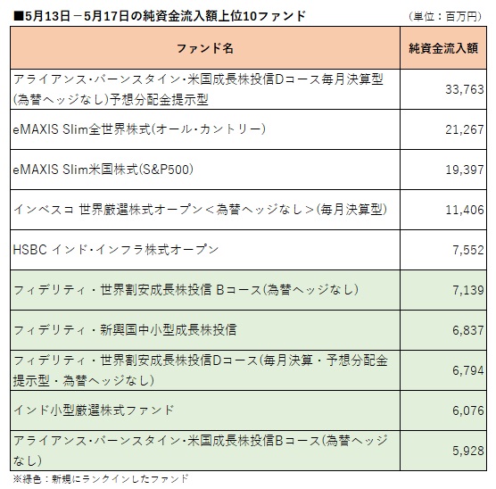 国内公募追加型株式投信(確定拠出年金専用、ファンドラップ専用、及びETF除く)を対象として、ウエルスアドバイザー推計値に基づいて先週(2024年5月13日−17日)の純資金流入額上位10ファンドを確認したところ、「アライアンス・バーンスタイン・米国成長株投信Dコース毎月決算型(為替ヘッジなし)予想分配金提示型」(=AB・米国成長株投信Dコース(H無) 予想分配金)」が4月15日−19日以来、4週ぶりのトップとなった。 「アライアンス・バーンスタイン・米国成長株投信Dコース毎月決算型(為替ヘッジなし)予想分配金提示型」は約338億円の純資金流入となった。同ファンドは5月15日に決算を行い、分配金を300円(1万口当たり、税引前)とした。同ファンドのほかには、「eMAXIS Slim全世界株式(オール・カントリー)」、「eMAXIS Slim米国株式(S&P500)」、「インベスコ 世界厳選株式オープン<為替ヘッジなし>(毎月決算型)」(愛称:世界のベスト)、「HSBC インド・インフラ株式オープン」が先々週(5月7日−10日)に続いてトップ10内となった。 先週新たにトップ10入りしたのは、「フィデリティ・世界割安成長株投信」(愛称:テンバガー・ハンター)の「Bコース(為替ヘッジなし)」と「Dコース(毎月決算・予想分配金提示型・為替ヘッジなし)」、「フィデリティ・新興国中小型成長株投信」(愛称:エマージング・ハンター)、「インド小型厳選株式ファンド」、「アライアンス・バーンスタイン・米国成長株投信Bコース(為替ヘッジなし)」の5ファンド。 「フィデリティ・世界割安成長株投信」の「Bコース(為替ヘッジなし)」、「フィデリティ・新興国中小型成長株投信」、「アライアンス・バーンスタイン・米国成長株投信Bコース(為替ヘッジなし)」3ファンドは4月30日−5月2日以来、「フィデリティ・世界割安成長株投信」の「Dコース(毎月決算・予想分配金提示型・為替ヘッジなし)」は4月15日−19日以来、「インド小型厳選株式ファンド」は3月25日−29日以来のランクインとなった。 一方、先々週トップ10入りしていたファンドのうち、「SBI・V・S&P500インデックス・ファンド」(愛称:SBI・V・S&P500)、「楽天・S&P500インデックス・ファンド」(愛称:楽天・S&P500)、「楽天・全米株式インデックス・ファンド」(愛称:楽天・VTI)、「楽天・オールカントリー株式インデックス・ファンド」(愛称:楽天・オールカントリー)、「iFreeNEXT FANG+インデックス」の5ファンドがトップ10圏外となった。