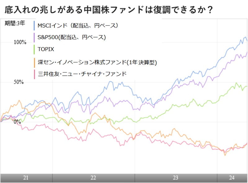 「中国株式は外せない資産」と強調する運用会社の商品企画やマーケティングの担当者は少なくない。中国株は2000年代に「BRICs(ブラジル・ロシア・インド・中国)」ブームに乗ってリーマンショックの前まで大幅に上昇する局面があり、リーマンショックの調整後も2015年頃までは新興国のリーダーとして株高局面が続いた。ところが、米中対立が先鋭化し、その後、中国不動産大手・恒大集団(エバーグランデ)の経営悪化などによって中国不動産バブル崩壊といった見方が台頭し、不良債権を抱えた銀行の経営不振によって経済が停滞する「日本化」の懸念が高まったこともあって株価が低迷する時期が続いている。MSCI中国指数は2021年から2023年まで3年連続で2ケタマイナス成長の不振だが、「中国株のPERはMSCI中国ベースで11倍程度と2000年以降の平均14.67%を大幅に下回る水準にある。3年連続で株価指数が下落(2000年〜2002年)した後には株価が大幅に反発した(2003年は80%上昇)こともあり、きっかけさえあれば中国株の復調が期待される」との見方もある。 中国政府は5月17日に、総合的な不動産支援策を発表した。何立峰副首相が売れ残っている不動産物件を地方政府が買い取って地域の低所得の住民向けに再販することを認めると発表した。同時に中国人民銀行(中央銀行)がローン金利の下限撤廃や頭金比率の引き下げなど住宅ローン規制の緩和を発表した。さらに、1兆元(1380億ドル)規模の貸付制度を確保し、手頃な価格の住宅向け再貸付制度(銀行融資5000億元相当)を立ち上げるほか、古い住宅が立ち並ぶ都市部の再開発といった政策を支援するため、担保補完貸付制度(5000億元規模)を利用可能にするとした。これを受け、恩恵が期待される銘柄を中心に買いが広がってCSI300不動産指数は同日に9.1%上昇した。中国政府の景気刺激策の動きが鈍いことが、株価の頭を抑えてきただけに、政府と中央銀行が足並みをそろえた対策を打ち出した意義は小さくないと考えられる。 中国政府の不動産対策を受けて5月17日の香港・ハンセン指数は19553ポイントと2023年5月以来約1年ぶりの高値に進み、上海総合指数や深セン成分指数も年初来の高値水準に上昇している。2024年になってからの年初来上昇率は、5月17日時点で、ハンセン指数は14.70%と、TOPIX(東証株価指数)の16.03%にはおよばないものの、米S&P500の11.18%や英FTSE100の8.88%、独DAXの11.66%を上回っている。中国本土の上海総合は6.02%、深セン成分指数は1.94%と遅れているものの、底入れ機運は高まりつつある。 3年連続で株価が下落したことによって中国株ファンドの人気も離散してしまっている。現在、中国を単独で投資対象にするファンドで残高トップの「深セン・イノベーション株式ファンド(1年決算型)」は残高が206億円しかない。このファンドは2021年6月には741億円の残高があったところから3分の1以下の水準だ。第2位の「三井住友・ニュー・チャイナ・ファンド」も176億円だ。こちらも2021年6月の残高約340億円から約半減している。このようにファンドの純資産総額が減少しているのは、株価が下落したことに加え、資金が流出した影響も大きい。多くの投資家が、この3年で中国株に見切りをつけて、投信を解約してしまったのだ。 しかし、今年に入ってファンドの基準価額は回復してきている。「深セン・イノベーション株式ファンド(1年決算型)」は4月末時点で過去3カ月のトータルリターンが24.18%、 「三井住友・ニュー・チャイナ・ファンド」も同16.14%と3カ月で2ケタリターンをあげている。これは、同期間の「eMAXIS Slim 米国株式(S&P500)」の10.78%、「eMAXIS Slim国内株式(TOPIX)」の8.55%などを上回る成績だ。もちろん、数カ月間のパフォーマンスが良かったからと言って、その結果だけで、これから先も期待できるというものではない。 ただ、2024年1−3月期の中国の実質GDP成長率は前年同期比5.3%と、市場予想を上回った。IMF(国際通貨基金)による2024年(通年)の経済成長率予測では中国は4.6%と、インドの6.8%には劣るものの、全世界の3.2%を上回り、米国の2.7%や日本の0.9%などを大きく上回っている。確かに、2003年〜2007年に見られた年率10%を超える高い成長は難しくなり、2023年の5.24%をも下回る成長率予想だが、先進国と比較すれば依然として高い成長を持続している。3年にわたって株価が下落したという動きを重ねれば、中国株に対する見直しの余地がでてくるのではないだろうか。株価が底入れの動きとなっている中国株の今後に注目していきたい。(グラフは底入れの兆しがある中国株ファンド)