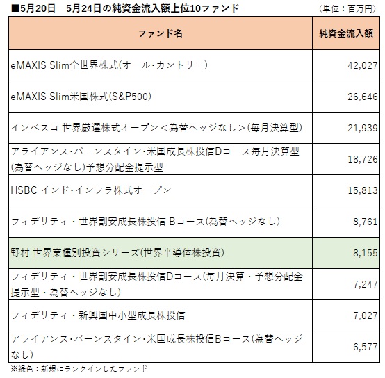 国内公募追加型株式投信(確定拠出年金専用、ファンドラップ専用、及びETF除く)を対象として、ウエルスアドバイザー推計値に基づいて先週(2024年5月20日−24日)の純資金流入額上位10ファンドを確認したところ、「eMAXIS Slim全世界株式(オール・カントリー)」が420億円の純資金流入となり、5月7日−10日以来2週ぶりのトップとなった。 同ファンドのほかには、「eMAXIS Slim米国株式(S&P500)」、「インベスコ 世界厳選株式オープン<為替ヘッジなし>(毎月決算型)」(愛称:世界のベスト)、「アライアンス・バーンスタイン・米国成長株投信」の「Dコース毎月決算型(為替ヘッジなし)予想分配金提示型」と「Bコース(為替ヘッジなし)」、「HSBC インド・インフラ株式オープン」、「フィデリティ・世界割安成長株投信」(愛称:テンバガー・ハンター)の「Bコース(為替ヘッジなし)」と「Dコース(毎月決算・予想分配金提示型・為替ヘッジなし)」、「フィデリティ・新興国中小型成長株投信」(愛称:エマージング・ハンター)が先々週(5月13日−17日)に続いてトップ10内となった。 先週新たにトップ10入りしたのは、「野村 世界業種別投資シリーズ(世界半導体株投資)」。約82億円の純資金流入で第7位となり、3月25日−29日以来8週ぶりのランクインとなった。 一方、先々週トップ10入りしていたファンドのうち、「インド小型厳選株式ファンド」がトップ10圏外となった。