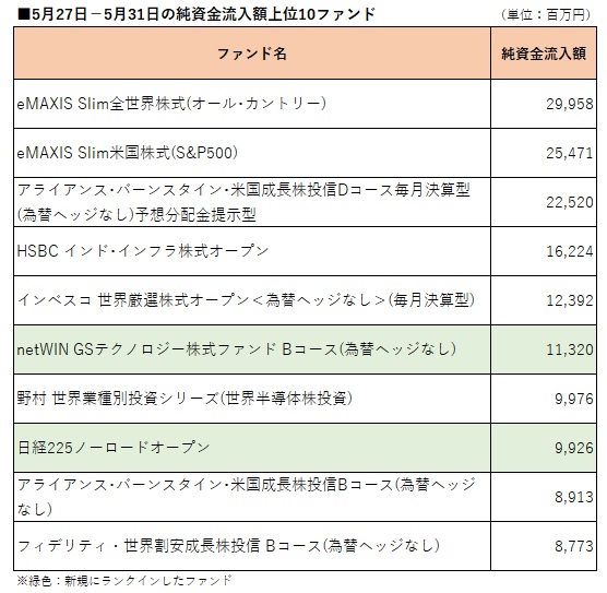 国内公募追加型株式投信(確定拠出年金専用、ファンドラップ専用、及びETF除く)を対象として、ウエルスアドバイザー推計値に基づいて先週(2024年5月27日−31日)の純資金流入額上位10ファンドを確認したところ、「eMAXIS Slim全世界株式(オール・カントリー)」が約300億円の純資金流入となり、先々週(5月20日−24日)に続いてトップとなった。 同ファンドのほかには、「eMAXIS Slim米国株式(S&P500)」、「アライアンス・バーンスタイン・米国成長株投信」の「Dコース毎月決算型(為替ヘッジなし)予想分配金提示型」と「Bコース(為替ヘッジなし)」、「HSBC インド・インフラ株式オープン」、「インベスコ 世界厳選株式オープン<為替ヘッジなし>(毎月決算型)」(愛称:世界のベスト)、「野村 世界業種別投資シリーズ(世界半導体株投資)」、「フィデリティ・世界割安成長株投信 Bコース(為替ヘッジなし)」(愛称:テンバガー・ハンター)が先々週に続いてトップ10内となった。 先週新たにトップ10入りしたのは、「netWIN GSテクノロジー株式ファンド Bコース(為替ヘッジなし)」と「日経225ノーロードオープン」。順に、2023年11月27日−12月1日、今年4月22日−26日以来のランクインとなった。「netWIN GSテクノロジー株式ファンド Bコース(為替ヘッジなし)」は5月30日に決算を行い、分配金(1万口当たり、税引前)を500円とした。 一方、先々週トップ10入りしていたファンドのうち、「フィデリティ・世界割安成長株投信」の「Dコース(毎月決算・予想分配金提示型・為替ヘッジなし)」と「フィデリティ・新興国中小型成長株投信」(愛称:エマージング・ハンター)がトップ10圏外となった。