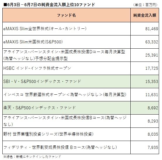 国内公募追加型株式投信(確定拠出年金専用、ファンドラップ専用、及びETF除く)を対象として、ウエルスアドバイザー推計値に基づいて先週(2024年6月3日−7日)の純資金流入額上位10ファンドを確認したところ、S&P500種株価指数への連動を目指す「SBI・V・S&P500インデックス・ファンド」(愛称:SBI・V・S&P500)と「楽天・S&P500インデックス・ファンド」(愛称:楽天・S&P500)がトップ10に返り咲いた。 両ファンドともに5月7日−10日以来、4週ぶりの返り咲きとなった。S&P500種株価指数は先週反発し、5日には過去最高値を更新した。第2位には「eMAXIS Slim米国株式(S&P500)」が先々週(5月27日−31日)に続いてランクインした。 純資金流入額トップは「eMAXIS Slim全世界株式(オール・カントリー)」。約815億円の純資金流入となり、3週連続のトップとなった。同ファンドと「eMAXIS Slim米国株式(S&P500)」のほかには、「アライアンス・バーンスタイン・米国成長株投信」の「Dコース毎月決算型(為替ヘッジなし)予想分配金提示型」と「Bコース(為替ヘッジなし)」、「HSBC インド・インフラ株式オープン」、「インベスコ 世界厳選株式オープン<為替ヘッジなし>(毎月決算型)」(愛称:世界のベスト)、「野村 世界業種別投資シリーズ(世界半導体株投資)」、「フィデリティ・世界割安成長株投信 Bコース(為替ヘッジなし)」(愛称:テンバガー・ハンター)が先々週に続いてトップ10入りした。 一方、先々週トップ10入りしていたファンドのうち、「netWIN GSテクノロジー株式ファンド Bコース(為替ヘッジなし)」と「日経225ノーロードオープン」がトップ10圏外となった。