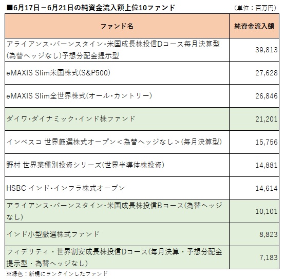 国内公募追加型株式投信(確定拠出年金専用、ファンドラップ専用、及びETF除く)を対象として、ウエルスア ドバイザー推計値に基づいて先週(2024年6月17−21日)の純資金流入額上位10ファンドを確認したところ、「アライアンス・バーンスタイン・米国成長株投信Dコース毎月決算型(為替ヘッジなし)予想分配金提示型」(=AB・米国成長株投信Dコース(H無) 予想分配金)が5月13−17日以来、5週ぶりのトップとなった。 「アライアンス・バーンスタイン・米国成長株投信Dコース毎月決算型(為替ヘッジなし)予想分配金提示型」は398億円の純資金流入となり、先々週(6月10−14日)の3位からランクアップした。6月17日に決算を行い、分配金(1万口当たり、税引前)を400円とした。 同ファンドのほかには、「eMAXIS Slim米国株式(S&P500)」、「eMAXIS Slim全世界株式(オール・カントリー)」、「インベスコ 世界厳選株式オープン<為替ヘッジなし>(毎月決算型)」(愛称:世界のベスト)、「野村 世界業種別投資シリーズ(世界半導体株投資)」、「HSBC インド・インフラ株式オープン」が先々週に続いて上位10位内となった。 先週新たにトップ10入りしたのは、「ダイワ・ダイナミック・インド株ファンド」、「アライアンス・バーンスタイン・米国成長株投信Bコース(為替ヘッジなし)、「インド小型厳選株式ファンド」、「フィデリティ・世界割安成長株投信Dコース(毎月決算・予想分配金提示型・為替ヘッジなし)」の4ファンド。順に、2023年12月25−29日以来、今年6月3−7日以来、同3月25−29日以来、同5月20−24日以来のランクインとなった。 4ファンドのうち、「ダイワ・ダイナミック・インド株ファンド」と「アライアンス・バーンスタイン・米国成長株投信Bコース(為替ヘッジなし)は6月17日に決算を行い、分配金(1万口当たり、税引前)を順に1200円、190円とした。「フィデリティ・世界割安成長株投信Dコース(毎月決算・予想分配金提示型・為替ヘッジなし)」は同20日に決算を行い、分配金(1万口当たり、税引前)を200円とした。 一方、先々週トップ10入りしていたファンドのうち、「次世代米国代表株ファンド」(愛称:メジャー・リーダー)、「楽天・S&P500インデックス・ファンド」(愛称:楽天・S&P500)、「フィデリティ・世界割安成長株投信 Bコース(為替ヘッジなし)」(愛称:テンバガー・ハンター)、「楽天・オールカントリー株式インデックス・ファンド」(愛称:楽天・オールカントリー)がトップ10圏外となった。