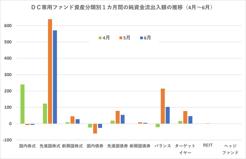 DC専用ファンドの2024年6月の純資金流出入額(速報値)は約774億円の資金流入超過になった。資金流入超過は2020年12月以降43カ月連続、流入額の規模は前月(994億円)より減少したものの、過去1年間の平均(673億円)を大きく上回っている。流入額のトップは前月同様に「先進国株式」で流入額は570億円だった。また、「バランス」に103億円の資金流入があった。一方、「国内株式」は前月(8億円の資金流出)に続いて2カ月連続の資金流出(約7億円)になった。国内株式は7月に入ってから、TOPIX(東証株価指数)が34年半ぶりに史上最高値を更新するなど、上昇力を強めている。6月は米国株価(S&P500とNASDAQ総合)こそ史上最高値を更新したものの、国内株は高値を更新するまで上がってはいなかった。この株価の勢いの差が資金流出入にも影響していると考えられる。 DC専用ファンド全体の純資産総額は約14兆96億円と前月から約5312億円増加して8カ月連続で過去最高を更新した。残高の内訳は、株式ファンド56%、債券ファンド12%、バランスファンド31%という割合で、前月と比較して株式ファンドの比率が1%ポイント高くなった。 (※個別のDC規約では、DC専用ファンド以外のファンドを制度に採用している場合があるため、DC専用ファンド全体の純資産総額は、国内DC制度全体で運用されているファンドの残高とは一致しない) ■資金流入額のトップは「野村 外国株式インデックスファンド(確定拠出年金)」 DC専用ファンドの過去1カ月間の純資金流入額ランキングのトップは、前月同様に「野村 外国株式インデックスファンド・MSCI−KOKUSAI(確定拠出年金向け)」だった。トップから5位までを先進国株式インデックスファンドが占め、トップ10のうち7銘柄を先進国株式インデックスファンドが占めた。 DC市場の人気銘柄は依然として「外国株式インデックスファンド」になっている。公募投信市場では、「S&P500」、または、「MSCI ACWI(オール・カントリー・ワールド・インデックス)」が人気を集めているにもかかわらず、DC市場にはその流れが届いていない。これは、DC市場が企業年金制度として制度に採用された投資商品にしか投資ができないという事情による。制度を運営する企業や、それをサポートする運営管理機関は、もっぱら加入者のために制度を運営すべき義務を負っているが、現在の制度の運用商品ラインナップは十分に加入者の希望をかなえているのだろうか? たとえば、「外国株式インデックスファンド」の1年トータルリターンは36%程度だが、「S&P500」は40%だ。年間4%程度の差であっても、最大で40年近くも運用するDC市場では将来的に大きな差となってくる。あるいは、公募投信市場では最近、話題になっているインド株に投資するファンドも、DC市場の売れ筋にはなかなか上がってこない。インド株に投資するファンドの中で、資金流入額が大きな「HSBCインド・インフラ株式オープン」は1年トータルリターンが76%だった。 もちろん、DC運用は1年などという短期間の運用成績の良し悪しを問うようなことはなく、20年、30年という長期の目線で考えるべき運用だ。しかし、現実の運用実態として、多くの加入者が外国株式ファンドを望み、資金も外国株式に集中している。本来であれば、「バランス型」が人気の中心であっても良いところだが、現実は、パフォーマンスの高い商品を加入者は求めているのだろう。その加入者の希望に、できるだけ応えるような商品選定を行い、適宜、その内容を見直しているのだろうか? 毎月、資金流入ランキングで「外国株式インデックスファンド」がずらりと並ぶ実態が何カ月にわたっても続いている現状は、改善の余地が大きいのではないだろうか。 ■トータルリターン1位は2カ月連続「DC次世代通信関連 世界株式戦略ファンド」 個別ファンドの過去1年間のトータルリターンランキングトップは、前月と同様に「DC次世代通信関連 世界株式戦略ファンド」になった。前月は第2位だった「DCトヨタ自動車/トヨタグループ株式ファンド」はトップ10圏外に後退した。トップ10は、外国株式ファンドばかりになった。 トップ10の中で6銘柄はアクティブファンドが占めているが、その他4銘柄はインデックスファンドで、中でも「S&P500」に連動するインデックスファンドが3銘柄もランクインしている。「S&P500」を超えるパフォーマンスを上げる米国株ファンドは少ないというのが実態であり、DC専用ファンドはまだラインナップされて間もないものの、このパフォーマンスの良さが続けば遠からず主力ファンドの1つに位置付けられそうだ。 ただ、公募投信市場においては、「野村 世界業種別投資シリーズ(半導体)」が1年トータルリターンで103%という成績をあげている。これに対して、DC専用ファンドのトップパフォーマーが63%にとどまるというのは、大きく見劣りする。「野村 世界業種別投資シリーズ(半導体)」は過去10年パフォーマンスでもカテゴリーでトップの成績になるなど、長期にわたって良いパフォーマンス