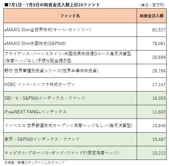 国内公募追加型株式投信(確定拠出年金専用、ファンドラップ専用、及びETF除く)を対象として、ウエルスアドバイザー推計値に基づいて先週(2024年7月1日−5日)の純資金流入額上位10ファンドを確認したところ、「キャピタル・グローバル・ボンド・ファンドF(限定為替ヘッジ)」など4ファンドが新規にランクインした。 「キャピタル・グローバル・ボンド・ファンドF(限定為替ヘッジ)」は102億円の純資金流入となり、第10位となった。トップ10入りは2023年以降で初めてとなる。同ファンドは、日本を含む世界の投資適格格付けの公社債を主要投資対象とするアクティブファンド。2024年5月末時点のポートフォリオの平均最終利回りは4.5%、国別構成比率上位は米国39.6%、日本7.2%、英国6.3%などとなっている。 同ファンドのほかには、「SBI・V・S&P500インデックス・ファンド」(愛称:SBI・V・S&P500)、「iFreeNEXT FANG+インデックス」、「楽天・S&P500インデックス・ファンド」(愛称:楽天・S&P500)が新規にランクインした。順に、今年6月3−7日以来、同5月7−10日以来、同6月10−14日以来のランクインとなった。 先週の純資金流入額トップは「eMAXIS Slim全世界株式(オール・カントリー)」。925億円の純資金流入となり、先々週(6月24−28日)に続いて2週連続のトップとなった。同ファンドのほかには、「eMAXIS Slim米国株式(S&P500)」、「アライアンス・バーンスタイン・米国成長株投信」の「Dコース毎月決算型(為替ヘッジなし)予想分配金提示型」、「野村 世界業種別投資シリーズ(世界半導体株投資)」、「HSBC インド・インフラ株式オープン」、「インベスコ 世界厳選株式オープン<為替ヘッジなし>(毎月決算型)」(愛称:世界のベスト)が先々週に続いてトップ10内となった。 一方、先々週トップ10入りしていたファンドのうち、「アライアンス・バーンスタイン・米国成長株投信」の「Bコース(為替ヘッジなし)」、「三井住友DS・ジャパン・ハイ・コンビクション・ストラテジー」、「フィデリティ・世界割安成長株投信」(愛称:テンバガー・ハンター)の「Bコース(為替ヘッジなし)」と「Dコース(毎月決算・予想分配金提示型・為替ヘッジなし)」がトップ10圏外となった。