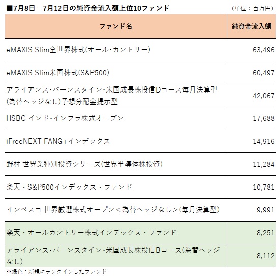 国内公募追加型株式投信(確定拠出年金専用、ファンドラップ専用、及びETF除く)を対象として、ウエルスアドバイザー推計値に基づいて先週(2024年7月8−12日)の純資金流入額上位10ファンドを確認したところ、「eMAXIS Slim全世界株式(オール・カントリー)」が3週連続のトップとなった。 「eMAXIS Slim全世界株式(オール・カントリー)」は約635億円の純資金流入となった。同ファンドのほかには、「eMAXIS Slim米国株式(S&P500)」、「アライアンス・バーンスタイン・米国成長株投信Dコース毎月決算型(為替ヘッジなし)予想分配金提示型」、「HSBC インド・インフラ株式オープン」、「iFreeNEXT FANG+インデックス」、「野村 世界業種別投資シリーズ(世界半導体株投資)」、「楽天・S&P500インデックス・ファンド」(愛称:楽天・S&P500)、「インベスコ 世界厳選株式オープン<為替ヘッジなし>(毎月決算型)」(愛称:世界のベスト)が先々週(7月1−5日)に続いてトップ10入りした。 先々週トップ10内に返り咲いたのは、「楽天・オールカントリー株式インデックス・ファンド」(愛称:楽天・オールカントリー)と「アライアンス・バーンスタイン・米国成長株投信Bコース(為替ヘッジなし)」の2ファンド。順に、6月10−14日以来4週ぶり、6月24−28日以来2週ぶりのトップ10入りとなった。 一方、先々週トップ10入りしていたファンドのうち、「SBI・V・S&P500インデックス・ファンド」(愛称:SBI・V・S&P500)、「キャピタル・グローバル・ボンド・ファンドF(限定為替ヘッジ)」がトップ10圏外となった。