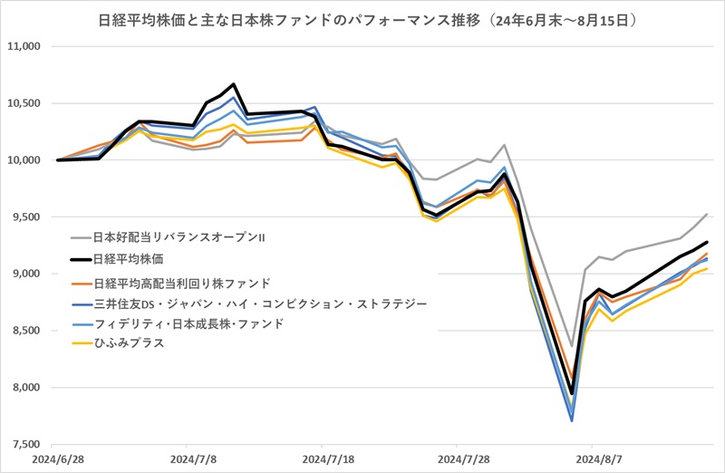 株価の乱高下が続いている。特に、7月から8月にかけて日本株の動きが激しくなっている。日経平均株価は7月11日に史上最高値の4万2224円を記録したものの、8月5日には史上最大の下落幅4451円安となり、翌6日には史上最高の上場幅3217円高を記録するなど、アップダウンの激しい値動きになっている。この激しい変動期に、個々のファンドの基準価額がどのような動きになっていたのかを調べてみた。一つには、純資産総額が大きな国内株ファンド、そして、国内株ファンドで資金流入額が大きなファンドをピックアップした。 ピックアップしたのは、純資産総額が大きな国内株ファンドとして「ひふみプラス」と「フィデリティ・日本成長株・ファンド」の2本。そして、直近で資金流入額が大きなファンドとして「三井住友DS・ジャパン・ハイ・コンビクション・ストラテジー」、「日経平均高配当利回り株ファンド」、「日本好配当リバランスオープン2」の合計5ファンドを調べた。 6月末時点を10000とすると、7月11日に株価が史上最高値になった時は、日経平均株価は10667だった。比較した5ファンドで最高は「三井住友DS・ジャパン・ハイ・コンビクション・ストラテジー」の10549、最低は「日本好配当リバランスオープン2」の10227だった。調べた5ファンドでは、上昇時にインデックスである日経平均株価を上回る上昇率になったファンドはなかった。個別のファンドの基準価額は信託報酬等を控除後の価格であるため、株価指数そのものよりも手数料の負担がある分、成績が劣後してしまうという側面はある。 一方、株価が最も値下がりした8月5日には、日経平均株価は7947になった。6月末比で20.53%安になった。最高値からの下落率は25.50%だ。この時点で、もっとも基準価額の水準が高かったのは、「日本好配当リバランスオープン2」の8363、そして、「日経平均高配当利回り株ファンド」の8084だ。この2ファンドは、株価下落時に日経平均株価よりも基準価額の水準が上にあった。また、最高値からの下落率は「日本好配当リバランスオープン2」は18.23%、「日経平均高配当利回り株ファンド」は21.21%と日経平均の下落率25.50%より軽微な下落率になっている。 最高値からの下落率では、「ひふみプラス」が24.24%、「フィデリティ・日本成長株・ファンド」は25.39%で日経平均株価よりも下落率がわずかに小さかった。「三井住友DS・ジャパン・ハイ・コンビクション・ストラテジー」は26.96%で日経平均株価よりも下落率がやや大きくなった。 そして、8月15日現在、日経平均株価は9278の水準に回復している。最安値からの上昇率は16.75%だ。これに対し、「日本好配当リバランスオープン2」は9525で日経平均株価を上回っている。安値からの上昇率は13.90%で日経平均株価に及ばないが、下落率を抑制した効果が最終的な収益で日経平均株価を上回った。次に、「日経平均高配当利回り株ファンド」で9176だった。安値からの上昇率は13.51%と5つのファンドの中で最も小さかったが、下落率が少なかったために、最終的な収益で他の3つのファンドを上回った。 「三井住友DS・ジャパン・ハイ・コンビクション・ストラテジー」は安値からの上昇率が18.56%と5つのファンドの中で最も高く、日経平均株価の上昇率を超えているものの、下落時の落ち込みが大きかったために、最終的に9135で日経平均株価に及ばなかった。次に「フィデリティ・日本成長株・ファンド」は安値からの上昇率は17.16%と日経平均株価を上回ったものの、最終的には9118と日経平均株価に及ばなかった。「ひふみプラス」は9043で5ファンドの中で最も低い成績になった。安値からの上昇率は15.72%で日経平均株価に劣後した。 これらの結果をみると、「日本好配当リバランスオープン2」や「日経平均高配当利回り株ファンド」など、配当利回りに着目したファンドのパフォーマンスが相対的に良いことがわかる。これらのファンドに資金流入が活発なのは、今年2月に34年ぶりに日経平均株価が史上最高値を更新し、その後も高値を更新する中で、日本株の一部に割高感があると言われ、高配当利回りなど割安株に安心感があるという理屈からだった。実際の値動きを追ってみても、株価が大きく下落する局面にあって、配当利回りの高い銘柄群は下落率が抑えられることで、日経平均株価よりも良い成績を残していた。 もっとも、株価が急速に戻る局面では、上昇率で日経平均株価に劣るという弱点もある。その辺のパフォーマンスの性格を捉えて投資判断に活かしていきたい。 この1カ月余りの動きだけで、それぞれのファンドの実力が分かるわけではない。この1カ月余りではパフォーマンスが良くなかった「ひふみプラス」は、過去10年でみると年率トータルリターンが11.21%で、同ファンドが入る「国内中型グロース」のカテゴリー平均9.21%を上回っている。それぞれのファンドで得手不得手な市場環境もあり、また、10年、20年という中長期に運用を継続してきている大型ファンド