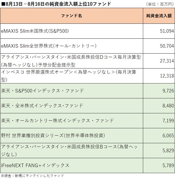 国内公募追加型株式投信(確定拠出年金専用、ファンドラップ専用、及びETF除く)を対象として、ウエルスアドバイザー推計値に基づいて先週(2024年8月13日−8月16日)の純資金流入額上位10ファンドを確認したところ、「楽天・S&P500インデックス・ファンド」、「楽天・全米株式インデックスファンド」、「楽天・オールカントリー株式インデックス・ファンド」、「野村 世界業種別投資シリーズ(世界半導体株投資)」、「アライアンス・バーンスタイン・米国成長株投信Bコース(為替ヘッジなし)」、「iFreeNEXT FANG+インデックス」の6ファンドが新規にランクインした。 「楽天・S&P500インデックス・ファンド」の純資金流入額は約97億円、「楽天・全米株式インデックスファンド」は約85億円、「楽天・オールカントリー株式インデックス・ファンド」は約72億円、「野村 世界業種別投資シリーズ(世界半導体株投資)」は約61億円、「アライアンス・バーンスタイン・米国成長株投信Bコース(為替ヘッジなし)」は約58億円、「iFreeNEXT FANG+インデックス」は約58億円で順資金流入ランキングの第5位から第10位になった。8月13日から16日は、その前週の株価急落から日米株価の戻りが鮮明になった1週間で日経平均株価やS&P500など日米の主要株価指数は13日から16日まで4連騰となった。「楽天・S&P500インデックス・ファンド」などのインデックスファンドや「野村 世界業種別投資シリーズ(世界半導体株投資)」や「アライアンス・バーンスタイン・米国成長株投信Bコース(為替ヘッジなし)」など今年の人気ファンドは、8月上旬の株価下落からの戻りで押し目買いの意欲が一段と高まったものと考えられる。 「eMAXIS Slim米国株式(S&P500)」、「eMAXIS Slim全世界株式(オール・カントリー)」、「アライアンス・バーンスタイン・米国成長株投信Dコース毎月決算型(為替ヘッジなし)予想分配金提示型」、「インベスコ 世界厳選株式オープン<為替ヘッジなし>(毎月決算型)」(愛称:世界のベスト)が先々週に続いてトップ10入りした。このうち、「eMAXIS Slim米国株式(S&P500)」は約511億円の純資金流入となり、前月トップの「eMAXIS Slim全世界株式(オール・カントリー)」に代わって2週ぶりにトップとなった。 一方、先々週トップ10入りしていたファンドのうち、「日経225ノーロードオープン」、「楽天 日本株4.3倍ブル」、「SBI 日本株4.3ブル」、「eMAXIS Slim国内株式(日経平均)」、「eMAXIS Slim国内株式(TOPIX)」、「eMAXIS 日経225インデックス」がランク外となった。いずれも国内株インデックスに関連するファンドだが、国内株の大幅な戻りによって「押し目買い」から「利食い売り」へと短期間に資金回転を実現した投資家も少なくないと考えられる。「日経225ノーロードオープン」は約26億円の資金流出に転じている。