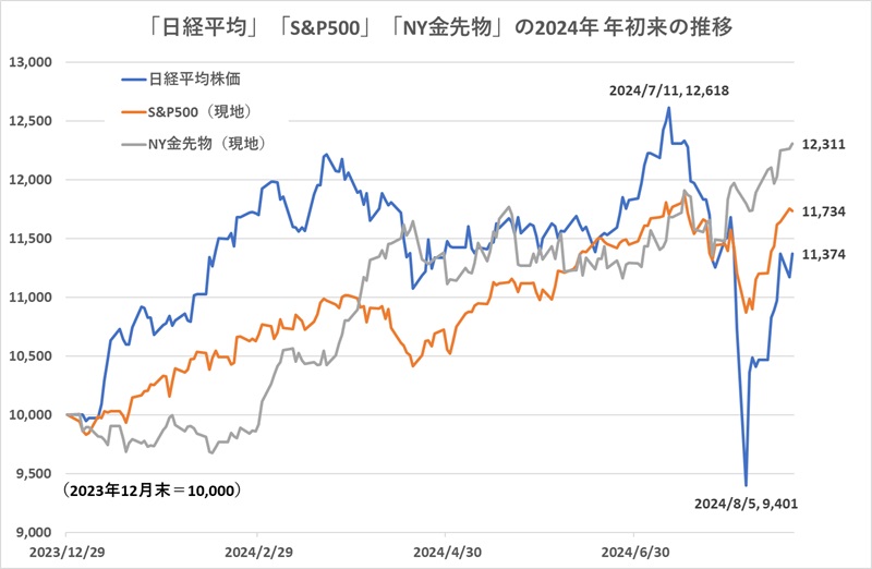 8月20日のNY金先物市場で12月限は1トロイオンス=2550.6ドルとなり、3日続伸し、3営業日連続で史上最高値を更新した。金価格は2023年10月に2000ドルの大台に乗せてから、緩やかな右肩上がりの動きを続けている。昨年末に2071ドルだった価格は、3月に2100ドル台に乗せ、5月に2400ドル台、そして、8月には2500ドル台になった。この8月20日までの上昇率では、米国株「S&P500」を上回る。9月に米国が利下げを実行すれば、金価格は一段と上昇するという見方が有力だ。株価が高値波乱となる中で、株価の動きとは関係なく動く金に投資することことも1つの方法だ。 2024年の年初からの動きを振り返ると、3月までは日本株(日経平均株価)の上昇が目立った。2023年に24%超値上がりした米国株(S&P500)に対し、出遅れが指摘されていた日本株が、その出遅れを取り戻すような動きになっていた。2月22日には日経平均株価は3万9000円の大台に乗せ、1989年のバブル期に記録していた史上最高値を34年ぶりに更新した。そして、7月11日にピークを付けるまで、日本株は米国株を上回るパフォーマンスを続けていた。7月11日時点では年初からの値上がり率は26.18%に達し、米国株の今年の高値(7月16日)までの上昇率18.81%を上回った。 ところが、7月末に日銀が追加利上げに踏み切ると、日本株は急落。8月6日には昨年末比5.99%安の水準に下落した。この日本株の急落と比較すると米国株の下落率は小さかった。日米株価は、8月6日をボトムに上昇するが、8月20日時点の年初来の上昇率では、日本株は13.74%で、米国株の17.34%に劣っている。 このような日米の株価の動向とは関係なく、金価格は緩やかに上昇し続けている。年初から2月末までは前年末比でマイナス圏に沈んでいる期間だったので、この間は株価とのパフォーマンス格差が大きく広がったが、3月からの金価格の上昇スピードは速く、また、8月上旬の株価急落の影響も小さかったため、8月20日時点では年初からの上昇率は23.11%となり、日米の株式よりも高いリターンを残している。 この金価格上昇の背景については、様々な要因が言われている。ひとつには、ロシア・ウクライナ戦争やイスラエル問題など、地政学的リスクの高まりによる「安全な逃避先」としての金の価値だ。金には貴金属として決して損なわれることのない希少価値がある。その希少性から、世界各国で通貨と同じような使われ方をしてきた。また、株価が企業の業績悪化や信用不安などで価値を棄損し、また、経営破たんになれば価値を失うという可能性があることに対し、金の価値は損なわれない。したがって、大きな戦争等が勃発すると、試算を守る手段として金が活用されてきた。また、インフレで通貨の価値が下がっていくような時にも金の価値が見直された。 さらに、近年では米国や中国などの中央銀行が外貨準備として金を購入する動きが強まっている。外貨準備は為替介入の時に使われたり、外貨建て債務の返済が困難になった時に使われるなど、一般的に国や通貨に対する信頼性を担保し、金融システムの安定化などに重要な役割を果たすと考えられている。金を購入している中央銀行は、「インフレヘッジ」、「危機的状況下でのパフォーマンス」、「効果的なポートフォリオ分散」などが金購入の目的になっている。ワールド・ゴールド・カウンシルの調査によると、今後も外貨準備に金を積み増していくという方針を持つ中央銀行が少なくないという。この中央銀行の買いも金価格を押し上げている要因になっている。 そして、「金利(利息)のつかない資産」である金は、金利上昇局面では相対的に魅力が落ちる資産になるが、金利低下局面になると通貨や債券等の魅力が低下することによって相対的な価値が高まる。現在の金価格の上昇には、9月にも米FRBが利下げを実施するという見通しが強まっていることも背景になっている。 個人投資家が金を投資対象に加える手段として、「三菱UFJ 純金ファンド『愛称:ファインゴールド』」、「ピクテ・ゴールド(為替ヘッジなし)」、「同(為替ヘッジあり)」、「ゴールド・ファンド(為替ヘッジなし)」など、金や金先物を投資対象にしたファンドがある。直接的に金を購入しなくても、ファンドとして購入することによって少額の資金で金を投資対象に加えることが可能だ。ただ、金には利息が付かないため、中長期の投資資産として「インカムゲイン」を期待できない資産になってしまうため、資産の大半を投資するような投資対象にはなりにくい。配当等のインカムゲインに加えて値上がり益(キャピタルゲイン)を狙える株式などをメインの投資対象とし、その株式とは異なる値動きをする金を資産の一部で持つことによって、株価下落等のリスクを軽減させるという使い方が一般的だ。 今年の値動きに、その金価格の特性は良く出ているといえるだろう。日米の株価が高値圏にある中で、景気見通しに不透明感が強まっている。8月初旬に起きたような株価の急落は、今