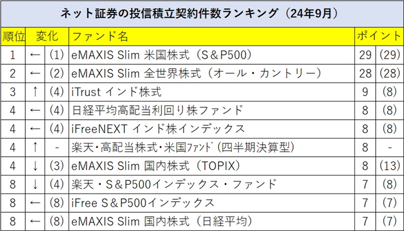 大手ネット証券3社の投信積立契約件数ランキング(月次)2024年9月のトップは「eMAXIS Slim 米国株式(S&P500)」、第2位は「eMAXIS Slim 全世界株式(オール・カントリー)」で前月と同じだった。第3位には前月の第4位から「iTrust インド株式」が浮上し、前月に第3位だった「eMAXIS Slim 国内株式(TOPIX)」は第4位に後退した。9月18日に新規設定されたばかりの「楽天・高配当株式・米国ファンド(四半期決算型)」が第4位に食い込んだ。 ランキングは、定期的に月次の投信積立契約件数トップ10を公表しているSBI証券、楽天証券、マネックス証券の公開情報を使用。各社ランキング1位に10点、以下、順位が落ちるたびに1点を減点し、第10位を1点として、3社のランキング10位までのファンドの点数を集計した。 「eMAXIS Slim 米国株式(S&P500)」と「eMAXIS Slim 全世界株式(オール・カントリー)」が圧倒的な存在感を発揮し、第1位と第2位の地位を盤石にしている。この他にも、第4位に「eMAXIS Slim 国内株式(TOPIX)」、第10位に「eMAXIS Slim 国内株式(日経平均)」がトップ10に入り、代表的なインデックスファンドにおける「eMAXIS Slim」のブランドは確立されたように思える。 このため、「楽天・S&P500インデックスファンド」や「iFree S&P500インデックス」など、他ブランドのインデックスファンドは、徐々にランキングを落とし、ランキングから姿を消すようにもなってきた。ネット証券のように、多くのファンドを揃えている販売会社にとっては、同じインデックスファンドといっても、やはり、個人投資家が安心感を持って購入できるブランドがあるファンドが優先的に選ばれるということだろう。 代わりに、他のインデックスファンドのブランドで順位を上げているのは、今月は第4位にある「iFreeNEXT インド株インデックス」や新設ファンドの「楽天・高配当株式・米国ファンド(四半期決算型)」など、代表的なインデックスファンドとは異なるプラスアルファの特長を持ったファンドになっている。もはや、「S&P500」も「全世界株式(オール・カントリー)」も、信託報酬は年0.1%を下回る水準にまで落ち込み、運用会社として収益を得るためには、数千億円という大型化しなければ旨味がない商品になっているといえよう。 これに対して、「iFreeNEXT インド株インデックス」は年0.47%、「楽天・高配当株式・米国ファンド(四半期決算型)」は年0.19%という信託報酬率だ。これらのファンドの手数料率もかなり低い水準に抑えられているものの、年0.1%を下回る水準にあるファンドと比較すれば、2倍以上の手数料率ということになる。手数料率は「安いに越したことはない」のであるが、その手数料率を上回る十分なリターンがあれば、運用商品としての魅力は備えているといえるだろう。 「インド株式」や「高配当株式」というのは、「S&P500」や「全世界株式(オール・カントリー)」に次いで人気を集めている分野になってきた。さらに、これに続く分野を運用会社が開拓できるか注目したい。