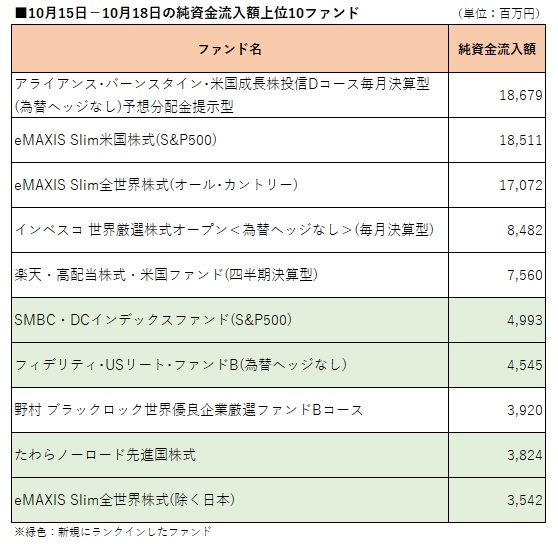 国内公募追加型株式投信(確定拠出年金専用、ファンドラップ専用、およびETF除く)を対象として、ウエルスアドバイザー推計値に基づいて前週(2024年10月15−18日)の純資金流入額上位10ファンドを確認したところ、「アライアンス・バーンスタイン・米国成長株投信Dコース毎月決算型(為替ヘッジなし)予想分配金提示型」(=AB・米国成長株投信Dコース(H無)予想分配金)が9月17−20日以来4週ぶりのトップとなった。 「アライアンス・バーンスタイン・米国成長株投信Dコース毎月決算型(為替ヘッジなし)予想分配金提示型」は約187億円の純資金流入となり、前々週(10月7−11日)の3位から浮上した。10月15日に決算を行い、分配金を200円(1万口当たり、税引前)とした。 同ファンドの他には、「eMAXIS Slim米国株式(S&P500)」「eMAXIS Slim全世界株式(オール・カントリー)」「インベスコ 世界厳選株式オープン<為替ヘッジなし>(毎月決算型)」(愛称:世界のベスト)、「楽天・高配当株式・米国ファンド(四半期決算型)」「野村 ブラックロック世界優良企業厳選ファンドBコース」が前々週に続いてトップ10入りした。 前週新規にランクインしたのは、「SMBC・DCインデックスファンド(S&P500)」「フィデリティ・USリート・ファンドB(為替ヘッジなし)」「たわらノーロード先進国株式」「eMAXIS Slim全世界株式(除く日本)」の4ファンド。「SMBC・DCインデックスファンド(S&P500)」は9月9−13日以来5週ぶり、「たわらノーロード先進国株式」と「eMAXIS Slim全世界株式(除く日本)」は9月17−20日以来4週ぶりにトップ10内に返り咲いた。「フィデリティ・USリート・ファンドB(為替ヘッジなし)」は今年初めてのランクインとなった。 一方、前々週トップ10入りしていたファンドのうち、「楽天・プラス・S&P500インデックス・ファンド」(愛称:楽天・プラス・S&P500)、「楽天・プラス・オールカントリー株式インデックス・ファンド」(愛称:楽天・プラス・オールカントリー)、「楽天・全米株式インデックス・ファンド」(愛称:楽天・VTI)、「グローバル・オポチュニティ・パートナーズ・ファンド」がランク外となった。 提供:ウエルスアドバイザー社