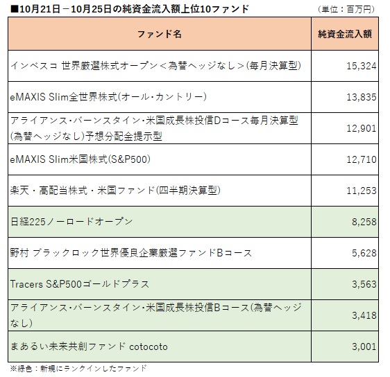 国内公募追加型株式投信(確定拠出年金専用、ファンドラップ専用、及びETF除く)を対象として、ウエルスアドバイザー推計値に基づいて前週(2024年10月21−25日)の純資金流入額上位10ファンドを確認したところ、「インベスコ 世界厳選株式オープン<為替ヘッジなし>(毎月決算型)」(愛称:世界のベスト)が今年初めてのトップとなったほか、4ファンドが新規にランクインした。 「インベスコ 世界厳選株式オープン<為替ヘッジなし>(毎月決算型)」は153億円の純資金流入となり、前々週(10月15−18日)の第4位からランクアップした。同ファンドのほかには、「eMAXIS Slim全世界株式(オール・カントリー)」「アライアンス・バーンスタイン・米国成長株投信Dコース毎月決算型(為替ヘッジなし)予想分配金提示型」「eMAXIS Slim米国株式(S&P500)」「楽天・高配当株式・米国ファンド(四半期決算型)」「野村 ブラックロック世界優良企業厳選ファンドBコース」が前々週に続いてトップ10入りした。 前週に新規にランクインしたのは、「日経225ノーロードオープン」「Tracers S&P500ゴールドプラス」「アライアンス・バーンスタイン・米国成長株投信Bコース(為替ヘッジなし)」「まあるい未来共創ファンド cotocoto」。「日経225ノーロードオープン」は9月9−13日以来、「アライアンス・バーンスタイン・米国成長株投信Bコース(為替ヘッジなし)」は9月30日−10月4日以来、「Tracers S&P500ゴールドプラス」は今年初めてのランクインとなった。「まあるい未来共創ファンド cotocoto」はコモンズ投信が10月21日に新規設定した。より良い未来の形成に向けて社会的にポジティブなインパクトを生み出す国内外の企業の株式に、長期的な視点で投資する。 一方、前々週トップ10入りしていたファンドのうち、「SMBC・DCインデックスファンド(S&P500)」「フィデリティ・USリート・ファンドB(為替ヘッジなし)」「たわらノーロード先進国株式」「eMAXIS Slim全世界株式(除く日本)」がランク外となった。※画像クリックで表拡大 提供:ウエルスアドバイザー社