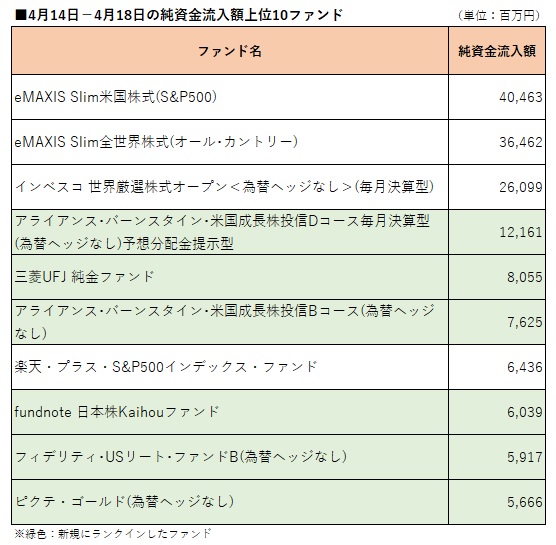 国内公募追加型株式投信(確定拠出年金専用、ファンドラップ専用、およびETF除く)を対象として、ウエルスアドバイザー推計値に基づいて前週(2025年4月14−18日)の純資金流入額上位10ファンドを確認したところ、金価格の上昇を背景にした金関連2ファンドなど6ファンドが新規にランクインした。 新規にランクインしたのは「三菱UFJ 純金ファンド」(愛称:ファインゴールド)「ピクテ・ゴールド(為替ヘッジなし)」の金関連2ファンドのほか「アライアンス・バーンスタイン・米国成長株投信」シリーズの「Bコース(為替ヘッジなし)」と「Dコース毎月決算型(為替ヘッジなし)予想分配金提示型」「fundnote 日本株Kaihouファンド」(愛称:匠のファンド かいほう)「フィデリティ・USリート・ファンドB(為替ヘッジなし)」。 「三菱UFJ 純金ファンド」は2024年以降で初「ピクテ・ゴールド(為替ヘッジなし)」は今年3月31日−4月4日以来「アライアンス・バーンスタイン・米国成長株投信」シリーズの2ファンドは同3月24−28日以来「fundnote 日本株Kaihouファンド」は設定時の同1月27―31日以来「フィデリティ・USリート・ファンドB(為替ヘッジなし)」は2024年10月15−18日以来のランクインとなった。 前週の純資金流入額トップは「eMAXIS Slim米国株式(S&P500)」。約405億円の純資金流入となり、3月24−28日以来3週ぶりのトップとなった。同ファンドのほかには「eMAXIS Slim全世界株式(オール・カントリー)」「インベスコ 世界厳選株式オープン<為替ヘッジなし>(毎月決算型)」(愛称:世界のベスト)「楽天・プラス・S&P500インデックス・ファンド」(愛称:楽天・プラス・S&P500)が前々週(4月7−11日)に続いてトップ10内となった。 一方、前々週ランクインしていたファンドのうち「eMAXIS Slim国内株式(日経平均)」「楽天・プラス・オールカントリー株式インデックス・ファンド」(愛称:楽天・プラス・オールカントリー)「eMAXIS Slim国内株式(TOPIX)」「楽天 日本株4.3倍ブル」「日経225ノーロードオープン」「iFreeNEXT FANG+インデックス」がランク外となった。 提供:ウエルスアドバイザー社