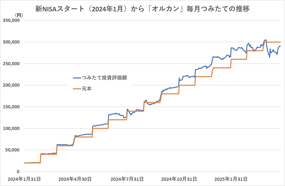 米トランプ大統領が打ち出す関税政策の影響で米国をはじめとして世界の株式市場が混乱し、株価が大きく下落したため、新NISAを機に投資を始めた人たちが肝を冷やしている。特に、4月2日にトランプ大統領が発表した大規模な「相互関税」によって株価が急落し、4月8日には米「S&P500」は5000ポイントの大台割れ、「NASDAQ総合」は2024年12月高値から約24%安の水準まで下落した時のショックは大きかっただろう。新NISAがスタートした2024年1月からコツコツとつみたて投資をしてきた人たちも含み損を抱えることになった。新NISA開始で強烈な資金流入があった「eMAXIS Slim 全世界株式(オール・カントリー)」(通称:オルカン)のつみたて投資を振り返って今後を展望したい。 「オルカン」でのつみたて投資は2024年12月末までは極めて順調に推移した。たとえば、新NISAがはじまった2024年1月から毎月末に2万円をつみたて投資するというプランだった場合、2024年12月末時点のつみたて投資の評価額は約26.6万円で元本の24万円を2万円以上上回っていた。つみたて投資開始以来、おおむね投資元本を上回る投資成績が継続し、2024年8月5日の急落時に当時の投資元本14万円を1万円ほど下回る評価損の時期があったが、それも8営業日でプラスに転換して事なきを得ている。翌9月にも一時的に評価損の時期があったが短期に回復し、結果的に月末時点での評価額はつみたて元本に対してプラスの評価を2025年3月末まで継続している。 ところが、4月4日に投資元本30万円に対して評価額が28.8万円とマイナス評価に落ち込んでからは、4月28日まで17営業日連続でマイナスの状態が続いている。ファンドの基準価額は月末に向けて上昇を続けているものの、月末時点で初めて投資評価がマイナスになることも想定される事態になっている。つみたて投資している人は、現在までの株価の動きに落ち着かない心持ちになっていることだろう。 米国の関税政策に関する株価の反応は、トランプ大統領や政権の主要メンバーの発言ひとつで将来の見通しが大きく変わってしまう可能性があることが一番悩ましい。それこそ、ニュースの見出し一つで株価が右往左往するような状態になってしまう。4月後半になって株価が持ち直している背景には、4月2日に発表した大規模な関税策を4月9日に「90日間凍結する」と発表し、その後は関税に対する強硬姿勢が徐々に緩和しているような発言が続いているということがある。これが、ある日突然、どこかの国との交渉が険悪な結果になるというようなニュースが出て、米政権が態度を硬化させたなどいう事態になれば、せっかくの安心ムードが一気に悪化する可能性もある。このため、株価が不安定な状態がしばらく続く可能性が高い。 新NISAのスタートを機に投資信託への投資を始めた人たちにとっては、初めてといってよい本格的な下落局面ということになる。株式に投資する場合は、価格変動があるということは事前にわかっていたとしても、実際に自分自身の資産が目減りしている現実に直面すると気持ちが動揺することにもなるだろう。そのような場合は、足元の状況だけに思考をしばられてしまうのではなく、落ち着いて広い視野で考えるようにしたい。 たとえば、より長い期間の実績を振り返ってみる。「オルカン」が設定された2018年10月31日を起点として約6年半のつみたて投資の結果をみると毎月2万円の積み立て投資で2025年3月末まで78カ月のつみたて投資元本は156万円。つみたて投資の評価額は約269万円になっている。4月に株価が下落しても余裕で投資元本を上回る成果が残っていることになる。 そもそも「つみたて投資」は、投資するタイミングをずらして分散化することによって価格変動リスクを抑える投資手法として知られている。価格変動リスクを抑えるということは、価格の下落時には市場の下落率に対して資産の目減りを小さく抑えるという効果にもなるが、同時に価格の上昇時にも大きな収益が得にくい投資手法だ。文字通り「コツコツと収益を重ねる」ことを目標としている。したがって、つみたて投資の期間が短いと積み上がった収益が少ないため株価の下落時に積み上げた収益以上のマイナスになることがある。つみたて期間が長くなるほどに積み上げた収益が大きくなるため、株価下落時にもマイナスに落ち込むことが少なくなっていくことになる。 もちろん、つみたて投資は長期につみたてを行えば必ずプラスの収益が得られるというものではない。つみたて投資期間に、投資対象にした資産が最終的にはプラスの成績になっていることが条件だ。中には、バブル崩壊後の日本株式市場のように10年以上にわたって下落し続けるようなこともある。そのように下落が継続しているような投資対象でつみたて投資をしていてもプラスの成績にはならない。つみたて投資の投資対象として「全世界株式(オール・カントリー)」や「米国株式(S&P500)」、あるいは、「国内株式(日経平均株価)」など株