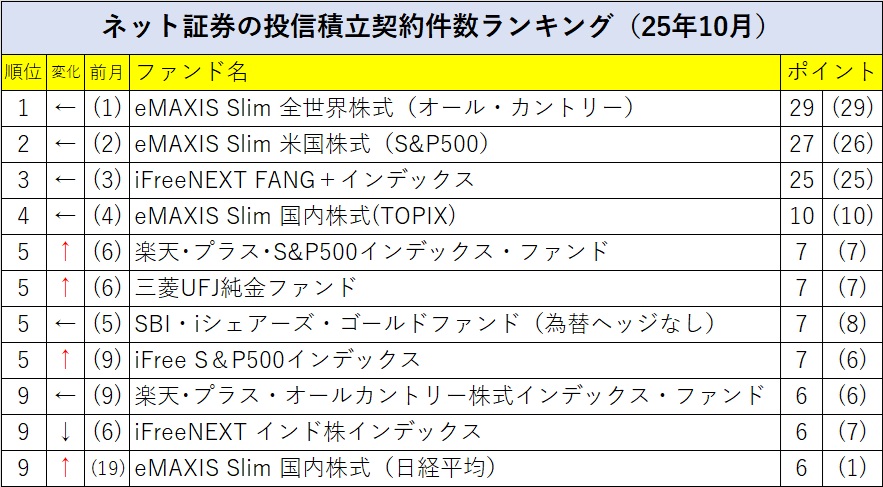大手ネット証券3社の投信積立契約件数ランキング(月次)2025年10月のトップ4は前月と同じだった。トップに「eMAXIS Slim 全世界株式(オール・カントリー)」(愛称:オルカン)、第2位は「eMAXIS Slim 米国株式(S&P500)」、第3位に「iFreeNEXT FANG+インデックス」、第4位は「eMAXIS Slim 国内株式(TOPIX)」だった。このトップ4は6月以来5カ月連続で同じだ。第5位には前月は第6位だった「楽天・プラス・S&P500インデッックス・ファンド」と「三菱UFJ純金ファンド」が上がり、「iシェアーズ・ゴールドファンド(為替ヘッジなし)」と並んだ。トップ10圏外から「eMAXIS Slim 国内株式(日経平均)」が第9位にランクインした。一方、前月は第6位だった「iFreeNEXT インド株インデックス」は第9位に後退した。 ランキングは、定期的に月次の投信積立契約件数トップ10を公表しているSBI証券、楽天証券、マネックス証券の公開情報を使用。各社ランキング1位に10点、以下、順位が落ちるたびに1点を減点し、第10位を1点として、3社のランキング10位までのファンドの点数を集計した。◆「日経平均」がトップ10にランクイン 10月は米国株が続伸し、「S&P500」が2.27%高、「NASDAQ総合」が4.70%高となり、いずれも史上最高値を更新した。「S&P500」は5月以来6カ月連続で上昇し、5月以来の上昇率は22.83%になっている。また、「NASDAQ総合」は7カ月連続での上昇(上昇率37.14%)を記録している。「eMAXIS Slim 米国株式(S&P500)」や「iFreeNEXT FANG+インデックス」といった人気銘柄に続いて、「楽天・プラス・S&P500インデックス・ファンド」、「iFree S&P500インデックス」など米国株インデックスファンドが一斉に順位を上げているのは、米国株式市場の先行きに対する期待が一段と高まってきたためだろう。 一方、国内株の「日経平均株価」も7カ月連続で上昇し、上昇率は累計で47.15%になっている。上昇率では米国「S&P500」を大きく上回っている。「日経平均株価」に連動するインデックスファンドを積立投資の対象ファンドにする動きが強まったのは、この上昇力を評価した動きと考えられる。国内株インデックスは、「eMAXIS Slim 国内株式(TOPIX)」が第4位につけ、決して無視されているわけではない。ただ、「TOPIX」の4月以来7カ月連続上昇の上昇率は25.32%にとどまっており、「日経平均株価」との上昇率の差は大きい。かねてより価格変動率が「TOPIX」と比較して大きいといわれる「日経平均株価」は、相場上昇期にあってはより大きな上昇率が期待される。今後、日本株への先高期待が高まるほどに「日経平均株価」に連動をめざすインデックスファンドの人気が高まることになる。◆明暗を分ける「純金」と「インド株」 「純金(ゴールド)」に投資する「三菱UFJ純金ファンド」が第5位にまで上がってきた。「株式」の配当や「債券」の利子に相当するインカム収益がない「純金」は長期に保有する資産としての魅力が一段低いとみられてきた。インカム収益がなければ価格低迷期にプラスの収益が見込まれず、インカム収益を積み重ねながら価格の上昇を待つということができないためだ。しかし、昨今の純金価格上昇を機に、中長期の積立投資対象として「純金」の価値が見直されている。景気変動等によって「株式」が下落するようなことがあっても「純金」は株価とは別の動きをするため、分散投資の手段としても人気がある。トップ5からさらに高く評価されるようになるのかどうか、注目したい。 「インド株」に対する評価は一段と厳しくなっている。今年2月には第4位にランキングされ、昨年においてもトップ10上位にたびたびランキングされる人気資産だったが、10月には第9位にまで順位を落とし、ネット証券3社のトップ10に入っているファンドは「iFreeNEXT インド株インデックス」だけになってしまった。2024年までは「iTrustインド株式」、「HSBC インド・インフラ株式オープン」など複数のインド株ファンドがネット証券3社のトップ10の中に入っていることが常態化していた。それが、3社合計のトップ10ランキングでも最下位にまで落ちた。インド株「SENSEX30」指数は、先進国株指数が上昇する中で7月、8月に連続して下落するなど上昇に勢いがないことが人気離散の要因といえる。ただ、足元のインド経済は堅調を維持し、中期的な経済成長期待も揺るがない。復調が待たれる。