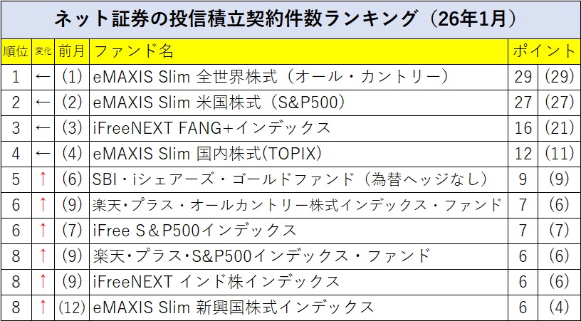 大手ネット証券3社の投信積立契約件数ランキング(月次)2026年1月のトップ4は前月と同じだった。トップに「eMAXIS Slim 全世界株式(オール・カントリー)」(愛称:オルカン)、第2位は「eMAXIS Slim 米国株式(S&P500)」、第3位に「iFreeNEXT FANG+インデックス」、第4位は「eMAXIS Slim 国内株式(TOPIX)」だった。このうち上位3ファンドは5月以来9カ月連続で同じだ。前月第5位だった「ニッセイ・S米国グロース株式メガ10インデックスファンド<購入・換金手数料なし>」(愛称:メガ10)はトップ10圏外に落ちた。また、前月第6位だった「SBI・iシェアーズ・ゴールドファンド(為替ヘッジなし)」が第5位に上がり、前月トップ10圏外だった「eMAXIS Slim 新興国株式インデックス」が第8位にランクインした。 ランキングは、定期的に月次の投信積立契約件数トップ10を公表しているSBI証券、楽天証券、マネックス証券の公開情報を使用。各社ランキング1位に10点、以下、順位が落ちるたびに1点を減点し、第10位を1点として、3社のランキング10位までのファンドの点数を集計した。◆オーソドックスな株式インデックスファンドを選好 1月の世界の株式市場は堅調となり、米国株は「S&P500」が1.37%高と反発して史上最高値を更新し、「NYダウ」も1.73%高で2025年5月以来9カ月連続高を記録した。また、「NASDAQ総合」は0.95%高と3カ月ぶりに反発した。そして、英国「FTSE100」は2.74%高と続伸して史上最高値を更新。国内株式は「日経平均株価」が5.93%高と大幅高し、「TOPIX(東証株価指数)」も4.62%高と続伸してそろって史上最高値を更新した。一方、新興国では中国の「上海総合」が3.76%高と堅調だったものの、インドの「SENSEX30」は4.07%安と下落した。 2026年になってからも、2025年の流れを引き継いで米国をはじめとした先進国の株式市場が堅調に推移する動きが確認できたことで、従来の積立人気ファンドが引き続き選好されている。前月まではトップ10の上位にあった「メガ10」がトップ10圏外に落ちたことから、新しい切り口の商品よりも、大型で市場を代表するような銘柄で構成されたオーソドックスなインデックスファンドが積立投資では好まれる傾向が強いことがわかる。◆3年連騰の先進国株高から分散も意識 1月のランキングでは「SBI・iシェアーズ・ゴールドファンド(為替ヘッジなし)」、「iFreeNEXT インド株インデックス」や「eMAXIS Slim 新興国株式インデックス」といった新興国株ファンドがランクアップしている。米国をけん引役にして先進国株式が過去3年間で2ケタ成長を続け、その恩恵で「全世界株式」も3年連続で大きく上昇した後とあって、株式の高値警戒感に対するリスクヘッジ手段としての「純金(ゴールド)」、また、出遅れ感のある「新興国株」にも分散投資ニーズが出てきているものと考えられる。今後、この分散投資の動きが、債券を含めたバランス型ファンドなどにも広がっていくものか注目していきたい。