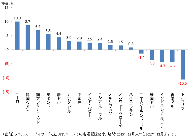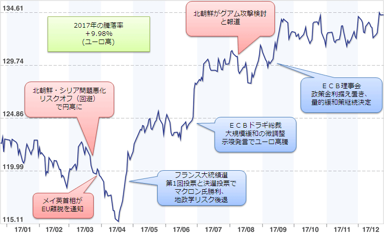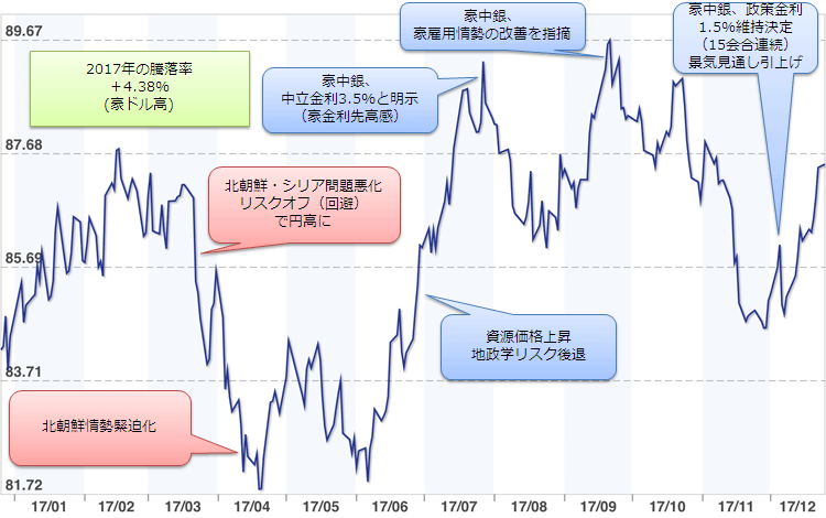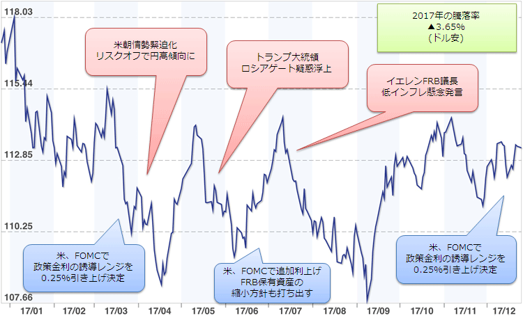 上半期は北朝鮮情勢やトランプ米大統領のロシアゲート疑惑などで、ドル・円が下落する局面があった。その後は、日米の金利政策の違いなどで持ち直し、年全体でみると1ドル=107-117円のボックス圏での推移となった。