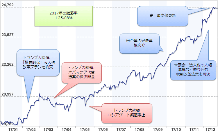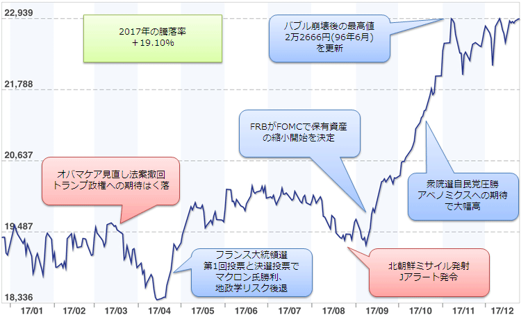 上半期は軟調な推移だったが、「アベノミクス」に対する期待感から、9月以降大幅に上昇に転じた。17年の日経平均株価は12月9日に一時2万3,000円台を回復し、1992年1月以来約26年ぶりの高値水準を付けた。