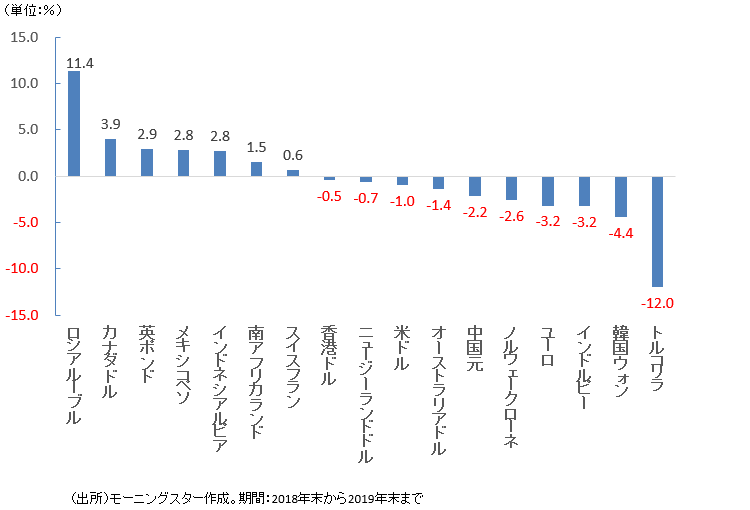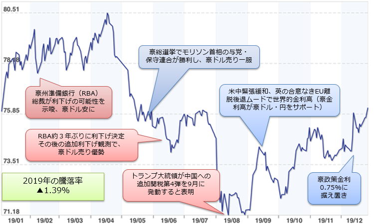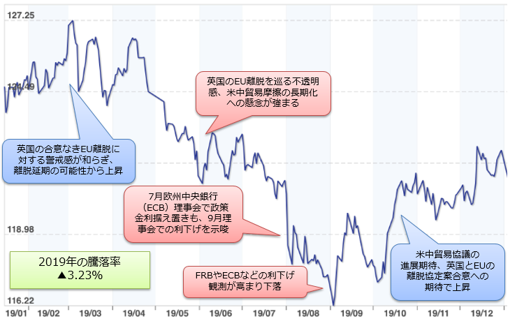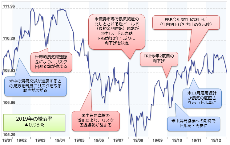 年中盤まで堅調な米景気を背景に1ドル=112円台まで上昇するも、夏場にかけては米中貿易摩擦の激化と世界的な景気減速への警戒感、米金融政策の緩和によりドル安・円高が進行し、8月には一時104円台まで下落。9月以降は米中通商協議の進展期待や米株式市場の上昇を受けて、投資家のリスク選好姿勢が強まり、年末にかけて109円台まで持ち直した。