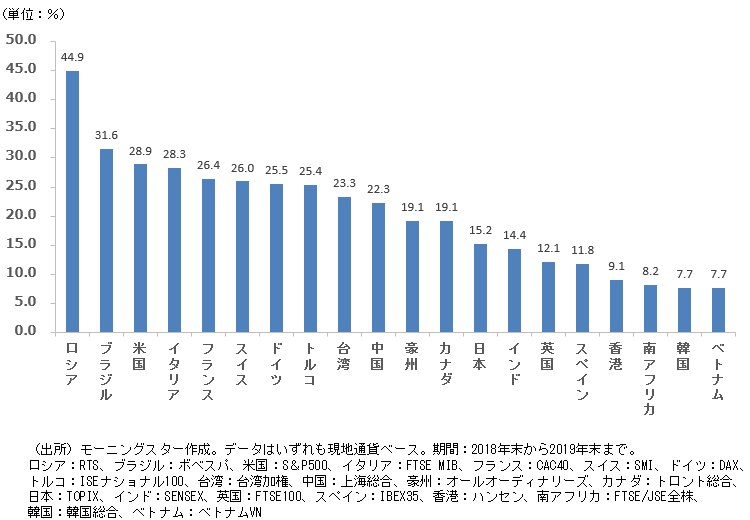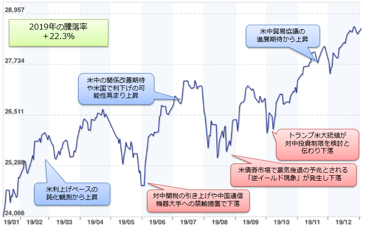 年初から4月にかけて、米中貿易協議の進展期待やFRB(米連邦準備制度理事会)の金融緩和姿勢への転換観測から上昇。その後、5月や8月にトランプ米大統領が中国への追加関税引き上げを示唆し調整する場面はあったものの、米中貿易協議の合意に期待が高まり、年末にかけては史上最高値を連日更新する展開となった。