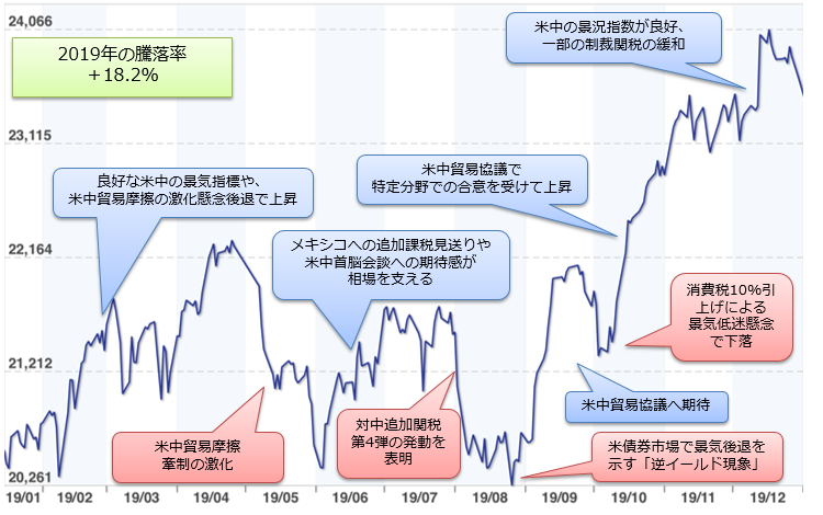 年前半は米中貿易摩擦などの影響で中国景気の悪化が鮮明となり、世界景気の後退を受けて日経平均は20,000円~22,000円の間で乱高下を繰り返す展開。年後半には米金利低下によって世界的に株が反発。さらに、米中貿易協議で特定分野での部分合意に達する見通しや、米中の景況指数も良好であり日経平均は大幅に続伸し、24,000円に達するまで回復。
