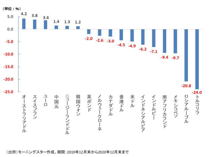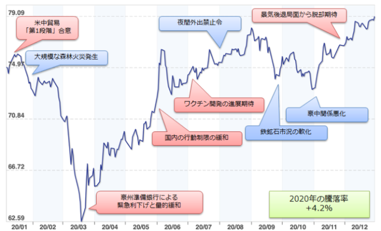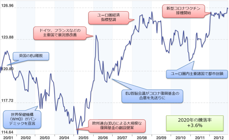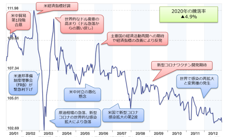 新型コロナ対策のロックダウンにより停滞した経済を安定させるためFRB(米連邦準備制度理事会)が2度にわたり政策金利を引き下げた。過度のリスクオフで保有資産の現金化(ドル需要の高まり)に伴うドル高が進む場面もあったが、日米欧など各国中銀がドル資金の供給を拡充すると落ち着きを取り戻す。年後半はワクチン開発による期待感もあったが新型コロナの変異種の発生もあり下落。