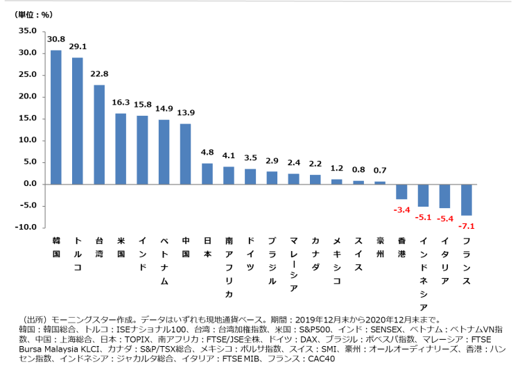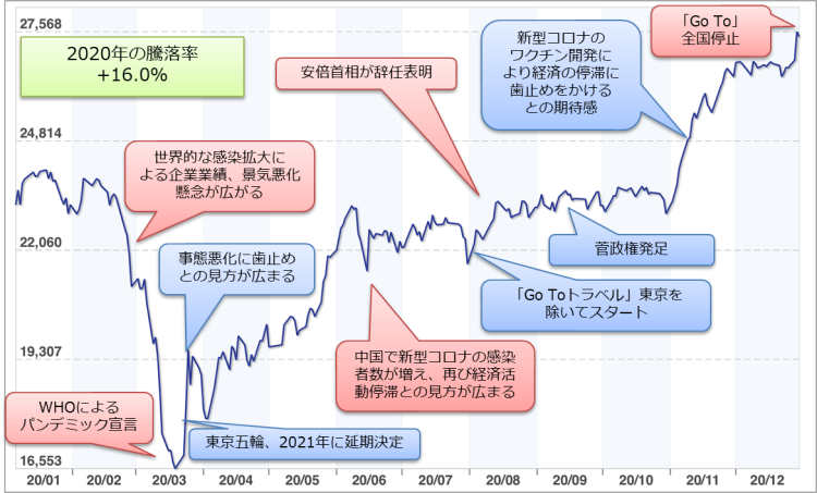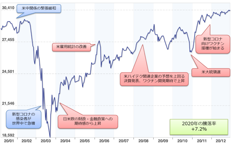 年初は相場を左右してきた米中関係に米国が中国製品への追加関税を下げることを盛り込んだ「第一段階の合意」に双方が署名し、高値を更新。しかし、2月後半以降は、新型コロナの感染拡大によりアメリカでも感染者や死亡例が急増。その後は、感染収束期待やワクチン開発期待により相場は反発。アメリカ大統領選後も株式市場は上昇し、NYダウは史上初となる3万ドルの大台を突破。