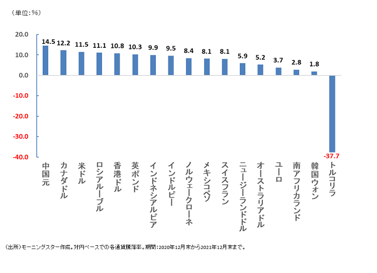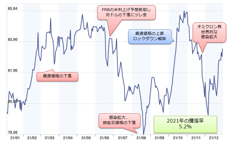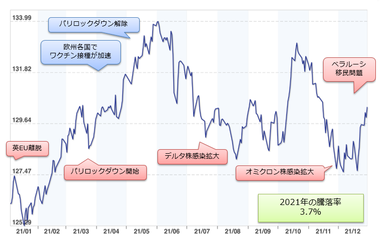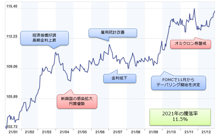 103円台で始まり、米経済指標の好調、長期金利上昇により、3月末には1ドル110円台へ。米長期金利の上昇一服により4月には107円台となるも、6月FOMC(米連邦公開市場委員会)で米政策金利見通しが上方修正され、7月初めは111円台に。一時は金利低下影響も、9月後半からの金利上昇に合わせて、円安進行。11月FOMCでテーパリング開始を決定したことでさらに円安となる。オミクロン株確認、警戒感が広がり、一時円高傾向となるも、米金利上昇に従い年末には年初来最安1ドル115円台となる。