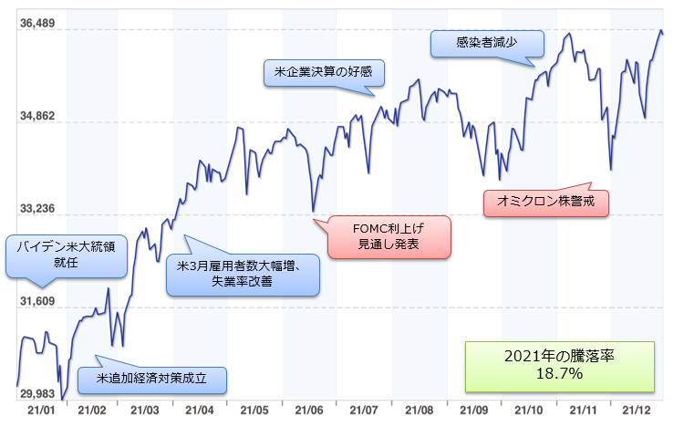 バイデン大統領就任直後は下落するも、追加経済対策成立後は回復。米経済指標好調もあり、最高値更新が続くなか、6月FOMCの利上げ見通しの発表により一時、相場下落。企業決算の好感が続き相場回復。9月頃より新型コロナ感染者減少傾向が続き最高値更新。11月オミクロン株確認後、一時相場下落、12月感染者が急拡大するも、年末には36,000ドル台の高値を回復した。
