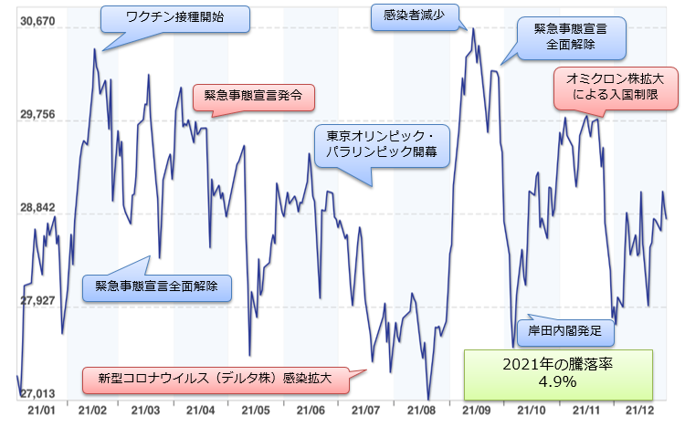 昨年に引き続き新型コロナウイルスに翻弄された一年となった。年初はワクチン接種による感染収束が期待され回復基調も1月後半、米影響により下落。2月よりワクチン接種開始、感染者減少、3月には緊急事態宣言全面解除で相場も回復。3月、デルタ株が国内でも確認され感染者拡大懸念により相場が下落傾向のなか、東京五輪の開催と感染者の増加が重なり相場も下落。9月に菅総理が退陣を表明。岸田内閣発足後、経済対策期待とワクチン接種が広がり感染者数が低水準が続いたことで相場も回復。11月オミクロン株が国内に持ち込まれ拡大懸念が生じたが、年末終値としては32年ぶりの高値となった。